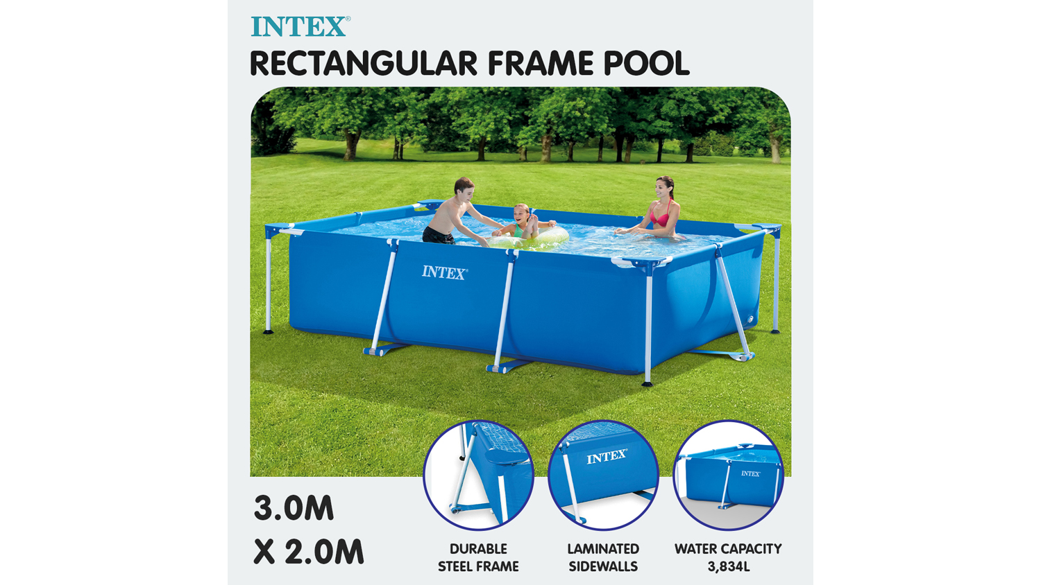 Beat the summer heat and enjoy quality time with your family using the Intex 3.0x2.0m Above Ground Rectangular Swimming Pool! Perfect for medium to large backyards, this rectangular pool is big enough to play games like volleyball, Marco Polo, and more. It also features a sturdy frame and laminated side walls to withstand many afternoons of splashing.