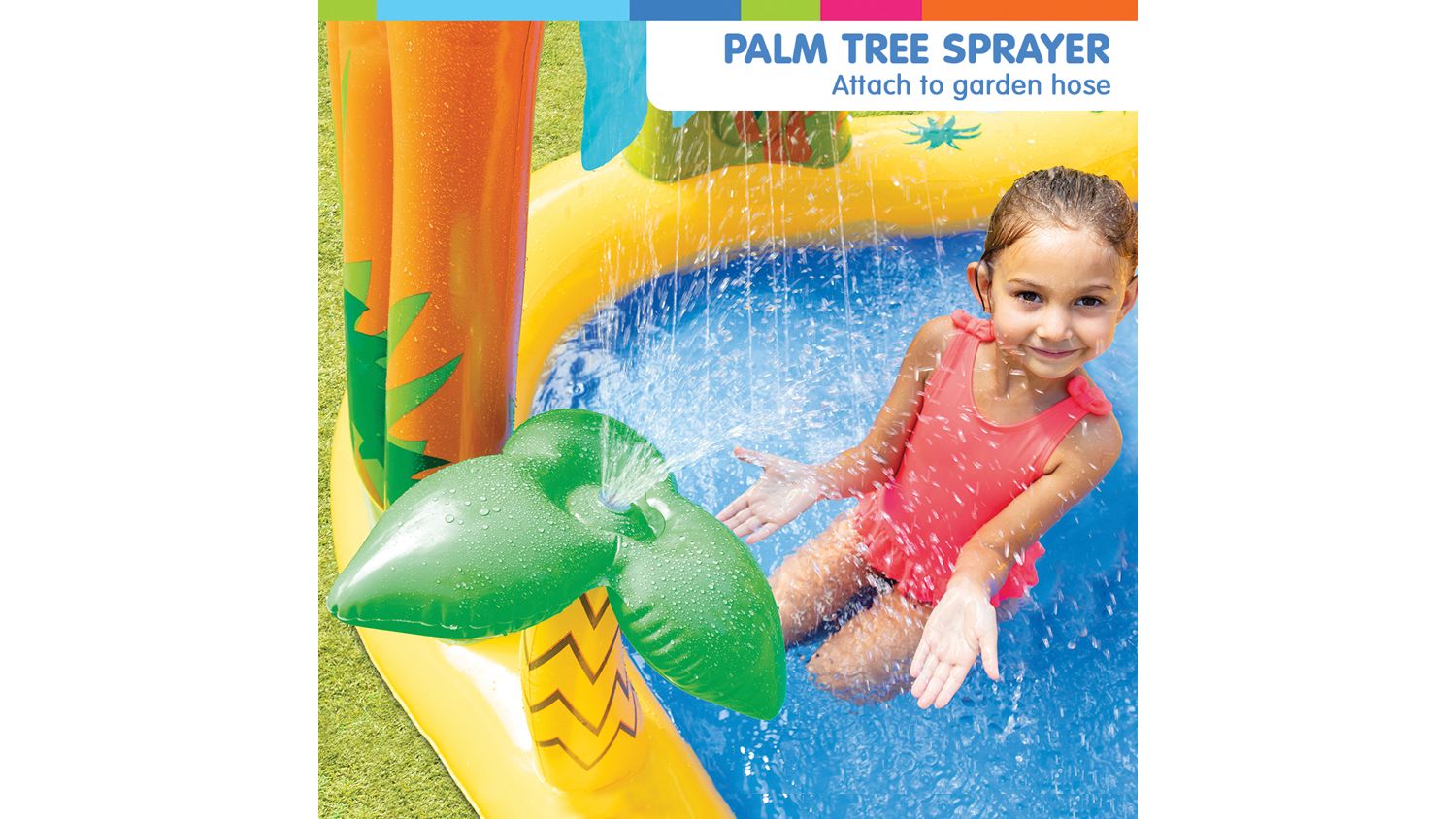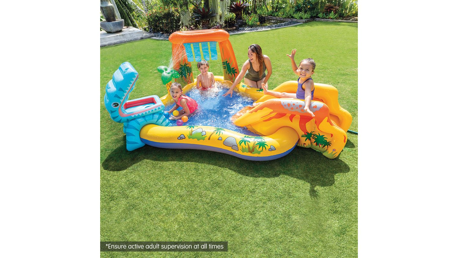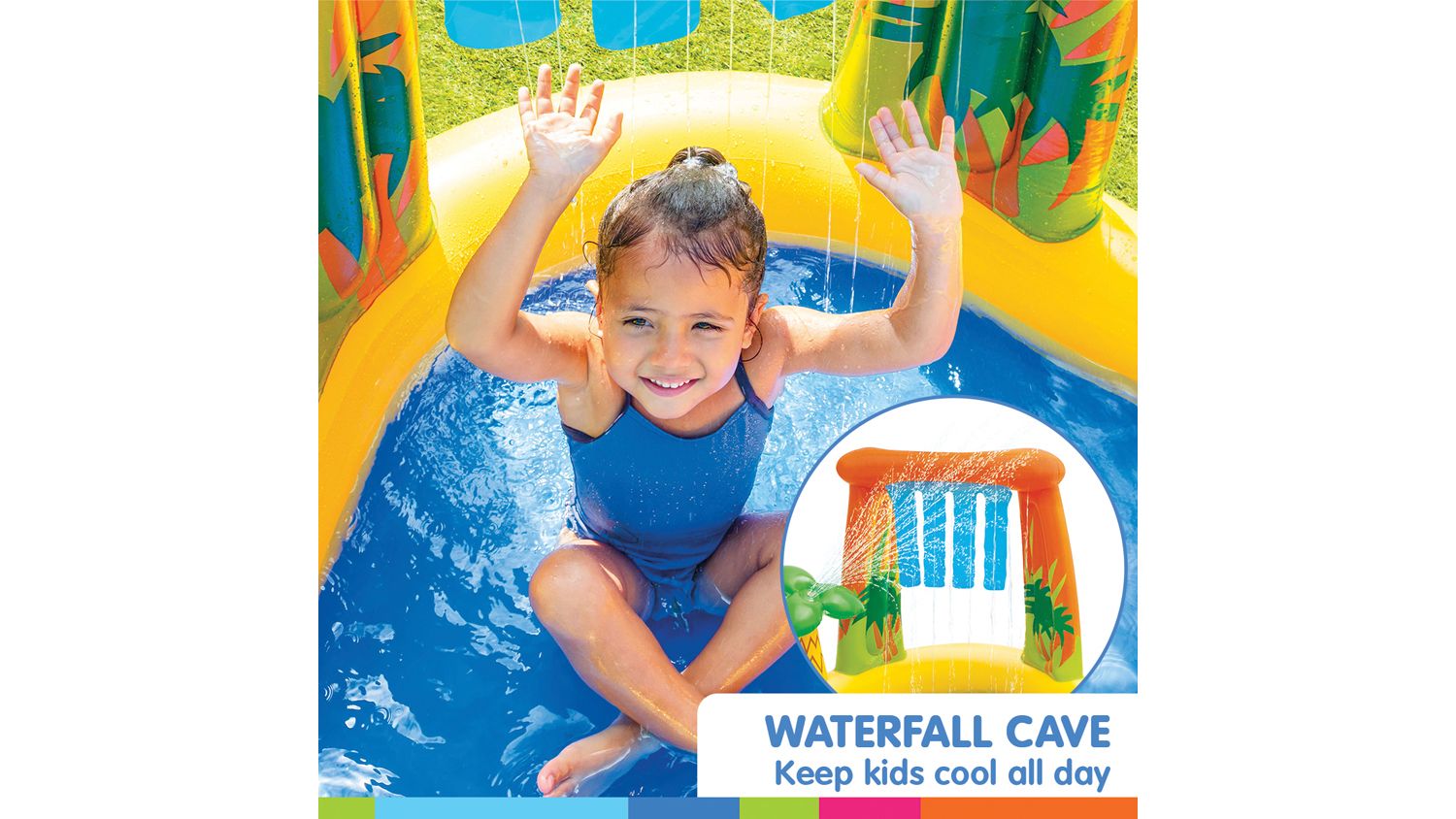 Turn your backyard into a kid’s terrific prehistoric water park oasis with the Intex Dinosaur Inflatable Kids Pool with Water Slide! A perfect summer activity for kids, this kiddie pool features a built-in palm tree sprayer, a waterfall, a hungry dinosaur ball game (with six colourful plastic balls), a volcano water slide, and a soft landing mat. It also measures approximately 8ft 2in x 6ft 3in x 3ft 7in and can hold up to 72 gallons of water, ideal for small to medium-sized backyards.
