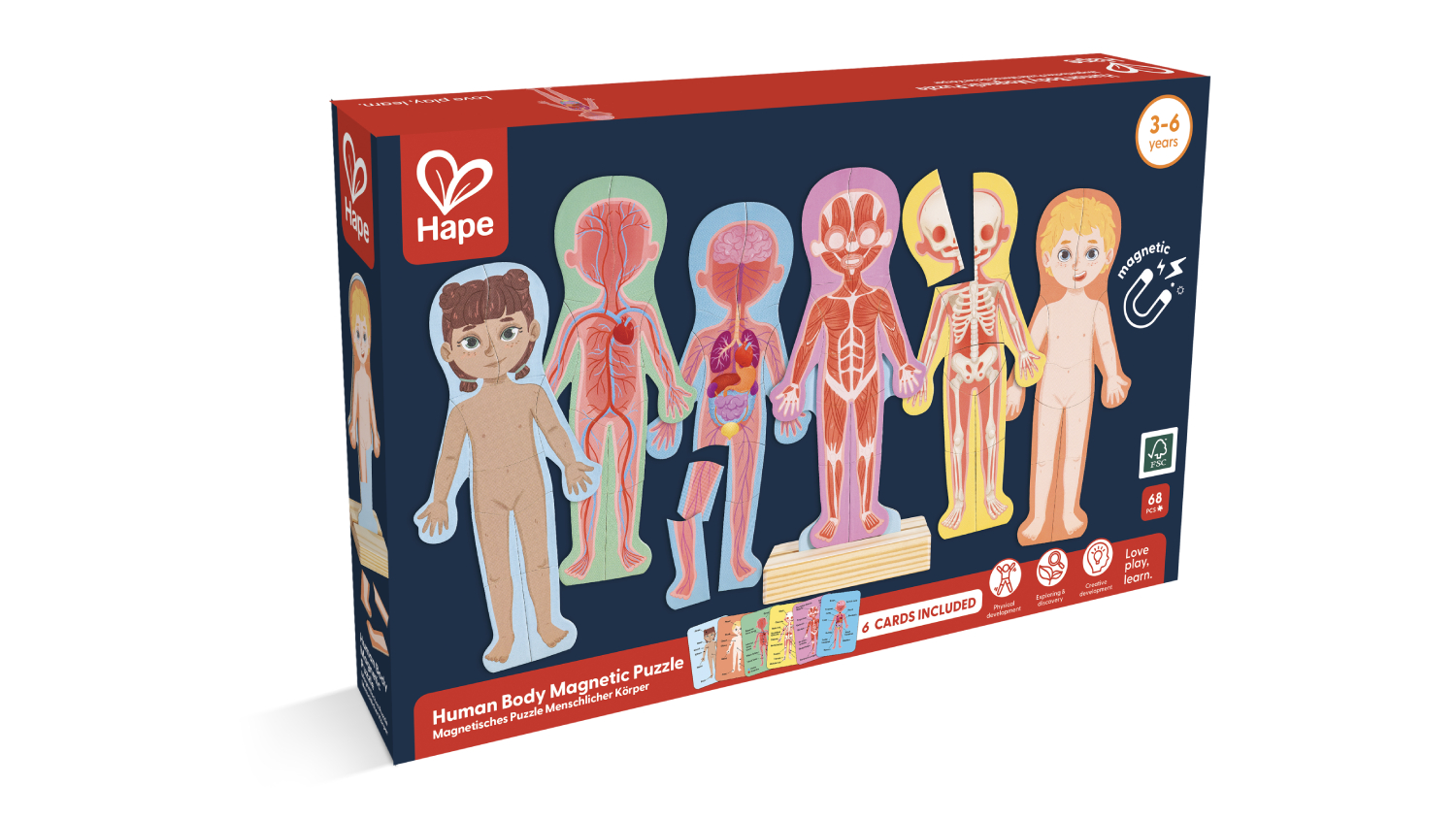The Hape Human Body Card Dolls let kids explore the amazing wonders of human anatomy. Explore, learn, and build the human body with interactive magnetic pieces. This set features adorable dress-up dolls and informative cards that teach them about different organs and body systems. Encourage imaginative play by pretending to be doctors with your child. They can use the magnetic puzzle pieces to 'diagnose' and 'treat' their patient.