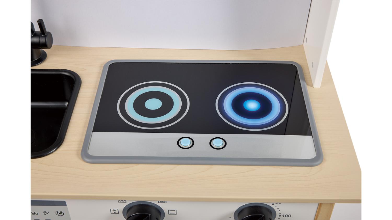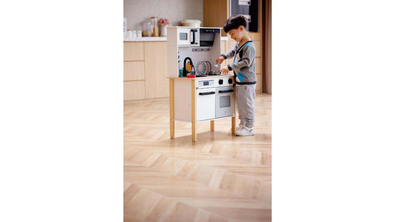 Let your little master chef whip up imaginative culinary creations with the Hape Modern Smart Play Kitchen! This set includes a sink with a faucet, an electronic stove, a metal pan, food items, and more for realistic cooking fun. Guide your children to wash and cut carrots, and operate the smart hood and stove to cook meals. After the meal, encourage them to put the dishes and utensils into the dishwasher, instilling the habit of tidying up after themselves.