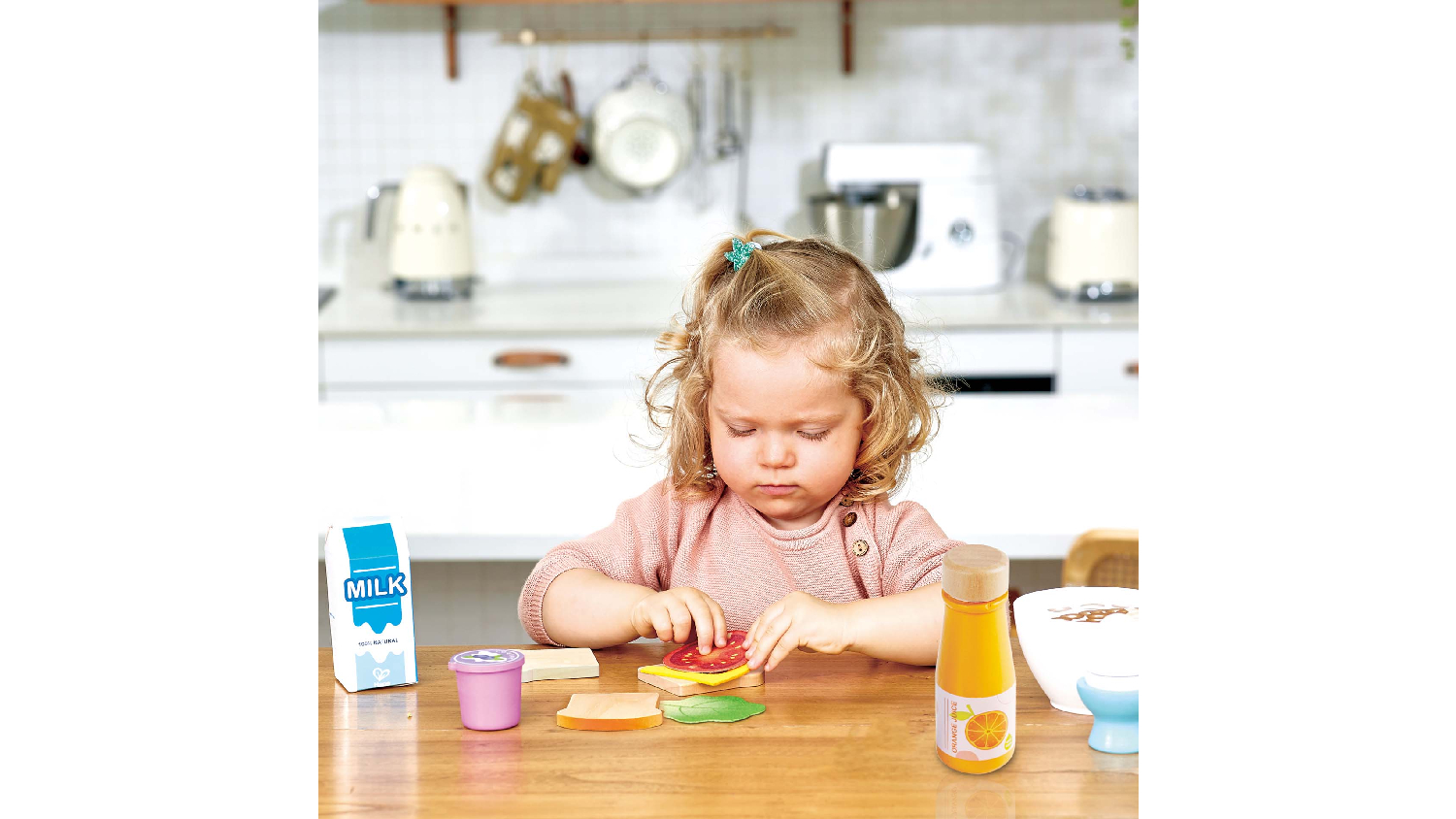 The Hape Play Food Set Delicious Breakfast lets your child create a mouthwatering pretend feast! It includes yummy-looking food pieces like yoghurt with a velcro lid, a clicky orange juice bottle, one boiled egg with eggcup, one bowl of oatmeal with a spoon, two slices of toast and one slice of tomato, lettuce and cheese. Smooth, rounded edges ensure safe grip and play, best of all, it helps to develop language, social skills, and fine motor skills.