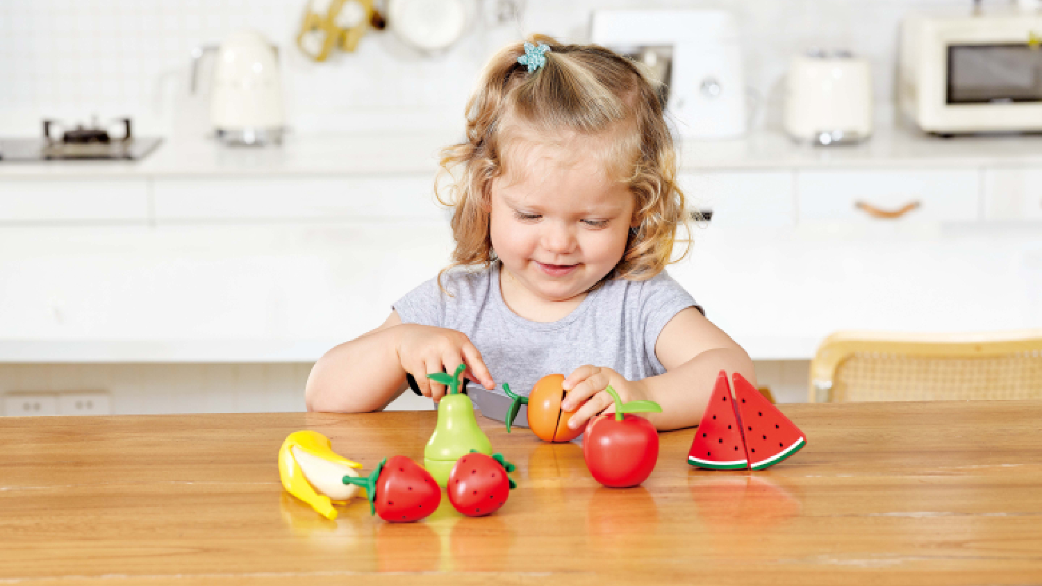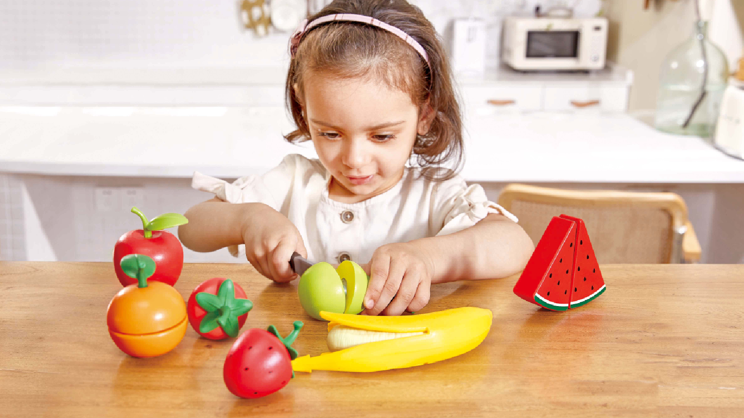 Cultivate healthy habits with the Hape Play Food Set Healthy Fruit! This set includes realistic-looking strawberries, a pear, an orange, an apple, a watermelon slice, a banana, and even a safe play knife for pretend chopping fun. Smooth, rounded edges make it perfect for little hands, while the variety of fruits encourages children to explore healthy food choices.