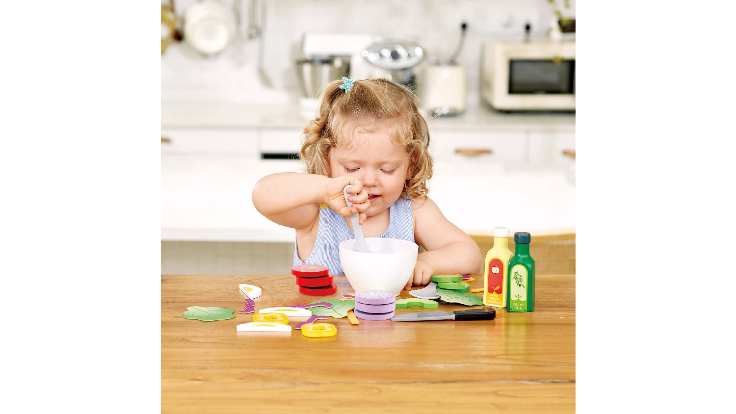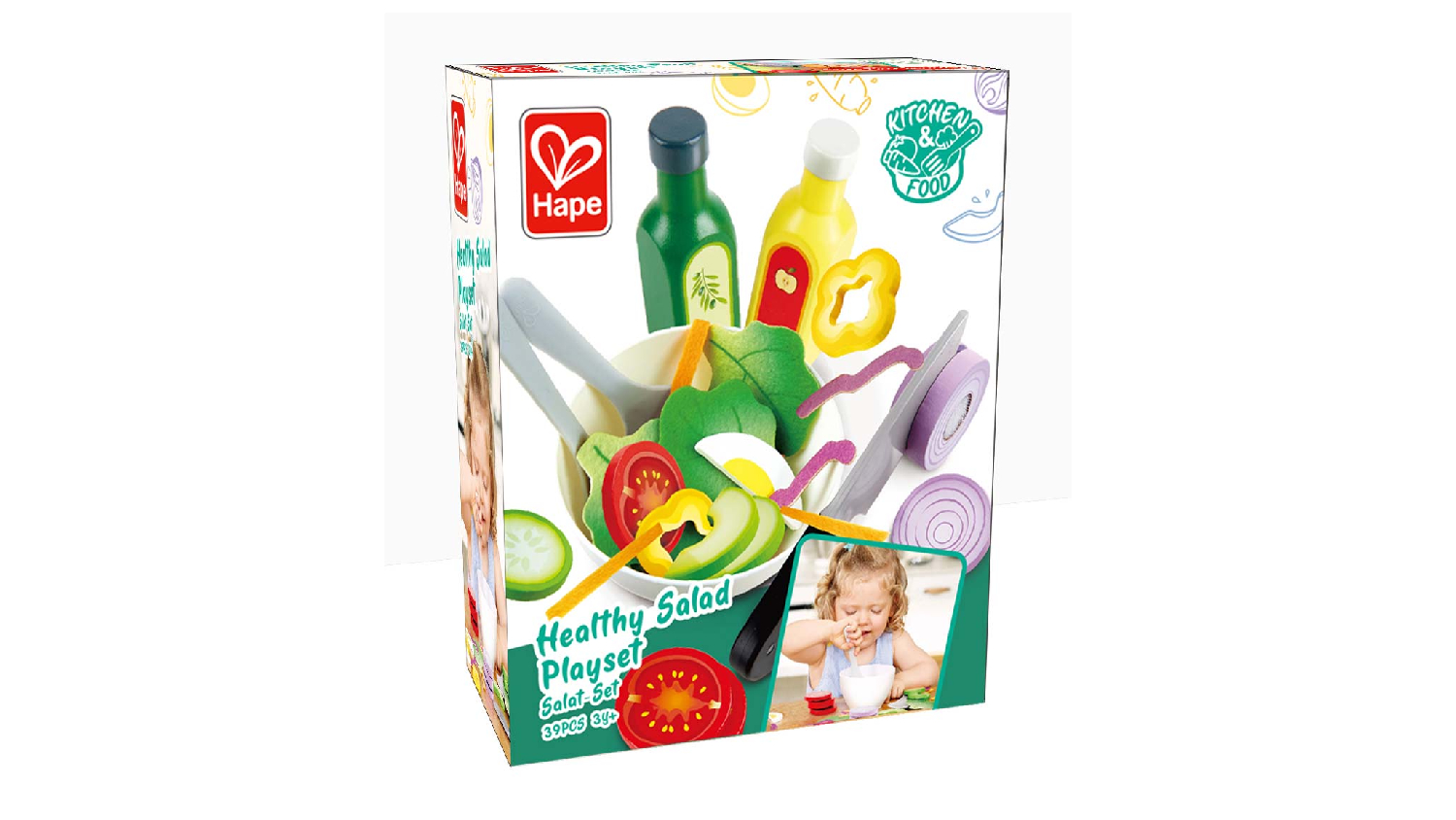 Cultivate nutritious habits with the Hape Play Food Set Healthy Salad! This set includes a realistic-looking salad bowl with a spoon and fork, two bottles of dressing, eggs, avocado, cucumber, potato, onions and other vegetable pieces and even a safe play knife for pretend chopping fun. Smooth, rounded edges make it perfect for little hands, while the variety of vegetables encourages children to explore healthy food choices.