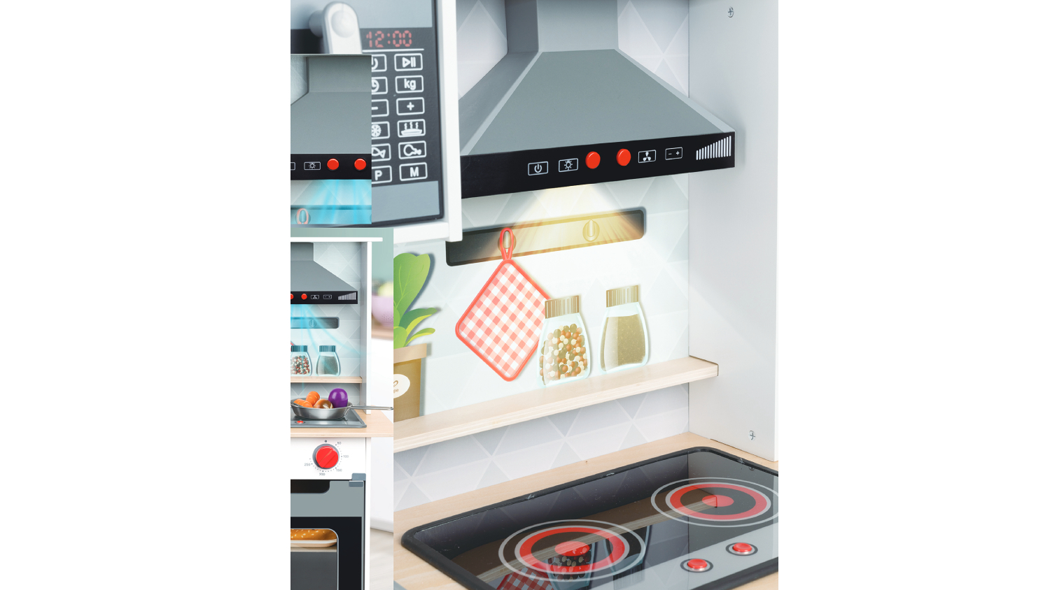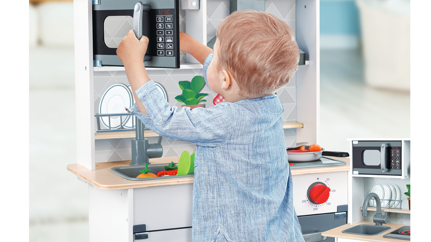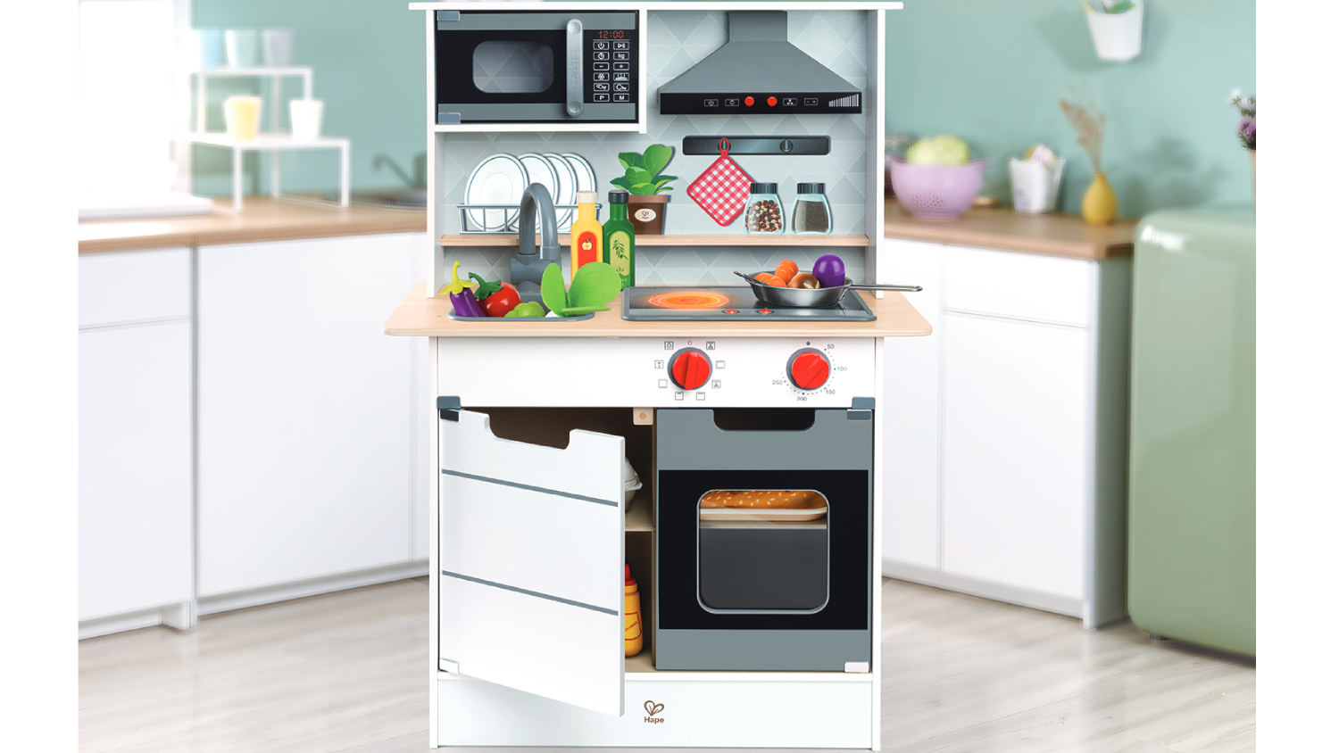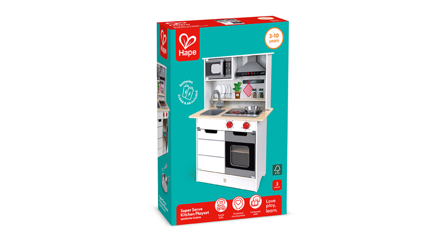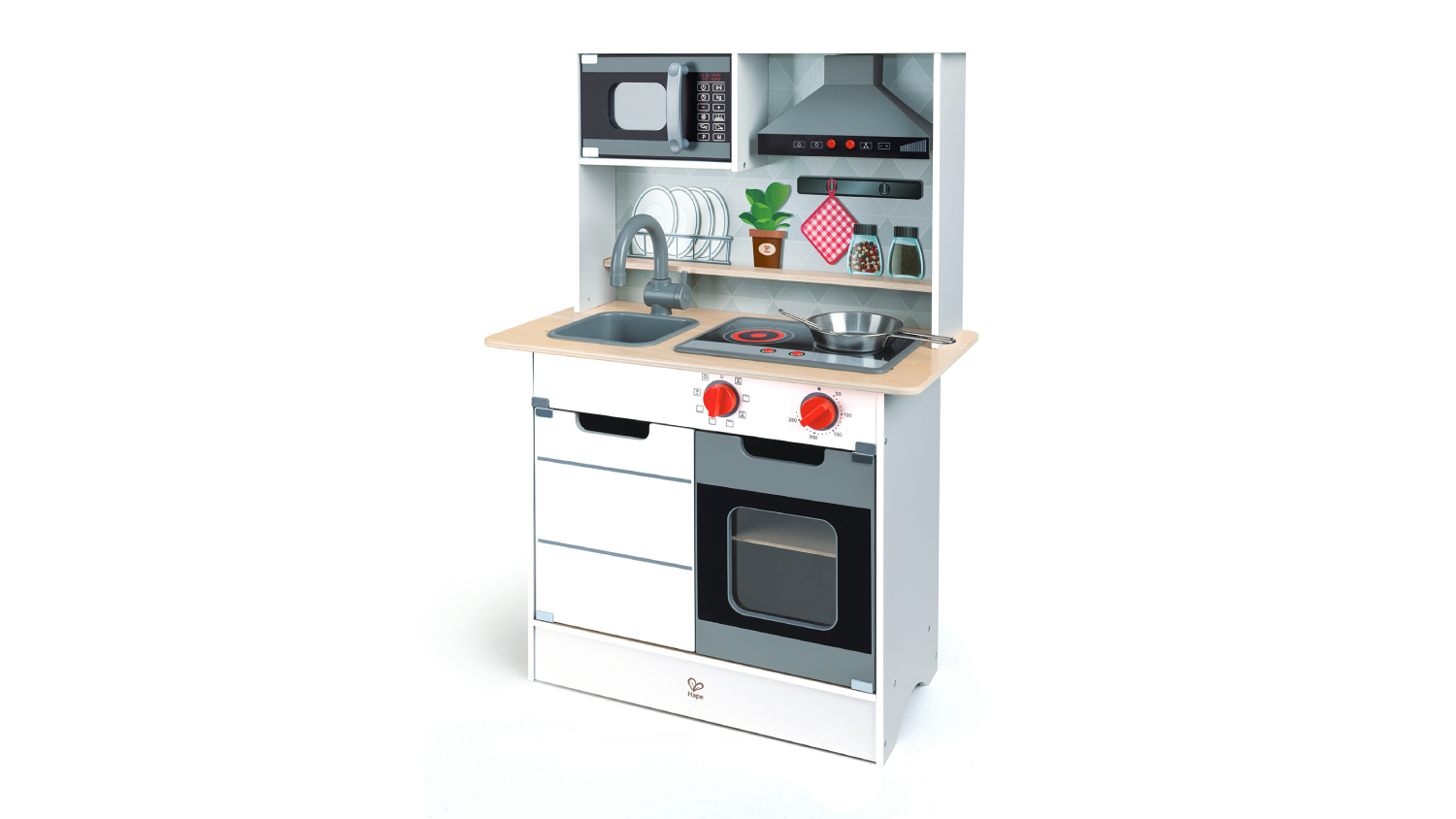 The Hape Super Serve Play Kitchen lets kids become star chefs with realistic sights and sounds. This interactive kitchen features two light-up stove rings with cooking sound effects, a range hood with extractor fan and effects, oven knobs that make a fun clicking sound when turned, and a sink with a moving faucet handle for immersive pretend play. It's the perfect gift for ages 3 and up, sparking creativity and unforgettable fun!