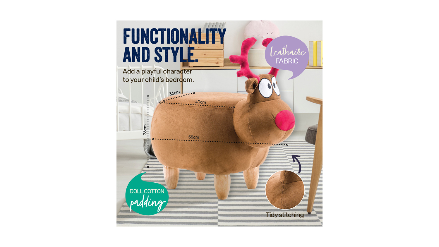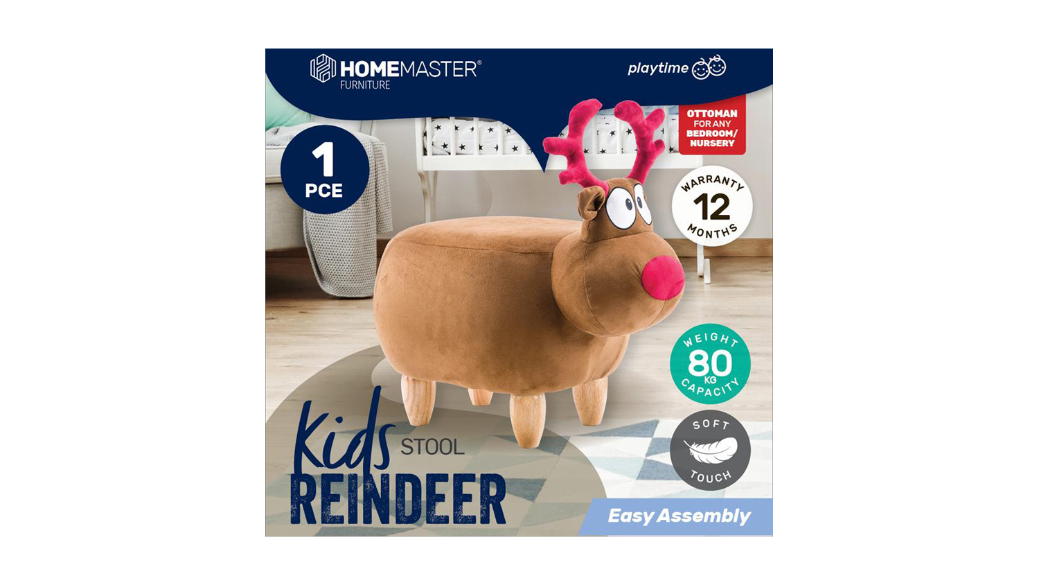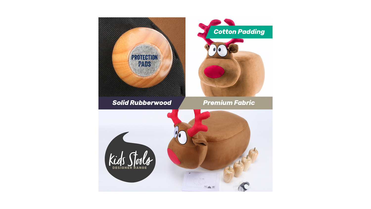 Add a playful touch to your child's bedroom with the Kids Animal Stool Reindeer. It's soft, easy to assemble, and made from high-quality materials. With tidy stitching and protection pads, this stool provides comfort and durability. It also has a weight capacity of 80kg for added convenience.