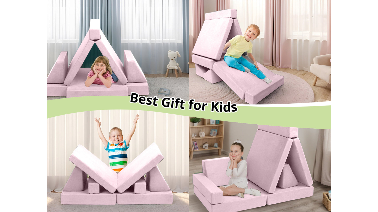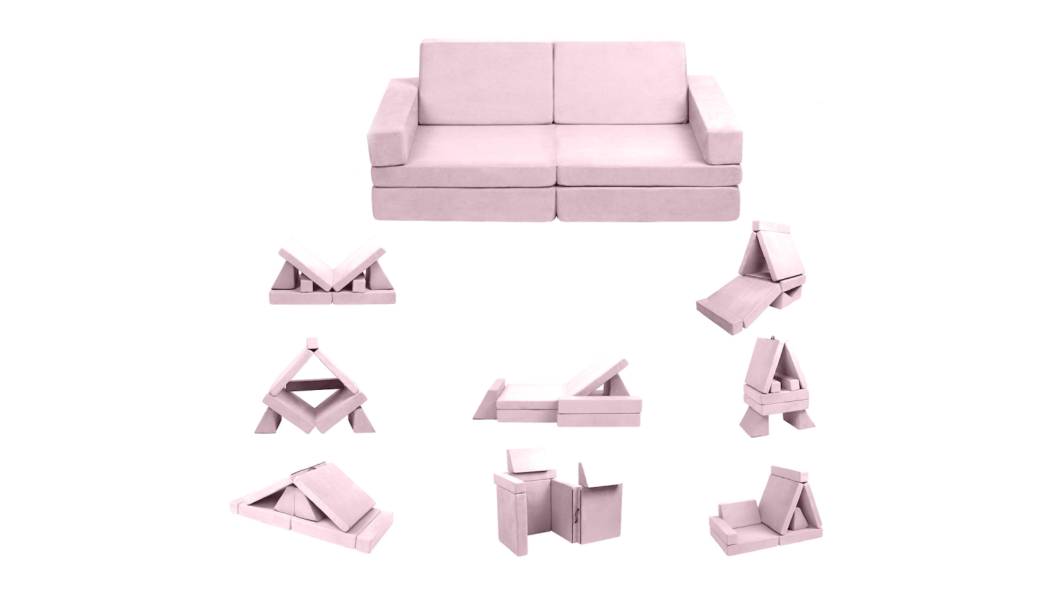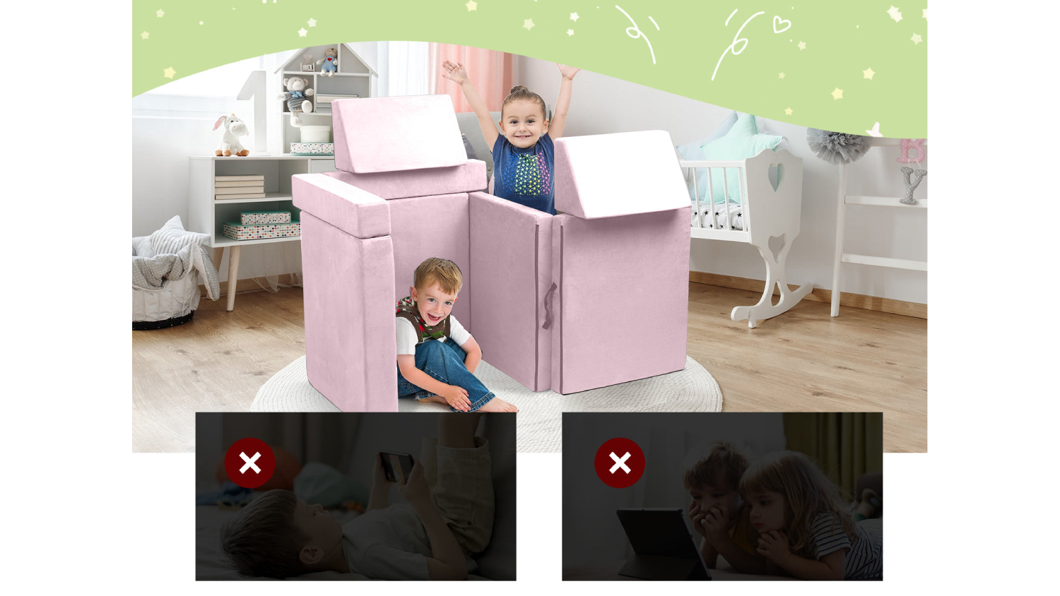 Make playtime extraordinary with the TSB Living Children's Play Couch! This modular play couch includes two foldable seats, two backrest cushions, and two triangle cushions that can be arranged into a fort, tunnel, or playhouse. Plus, it offers comfort and fun without any sharp edges!