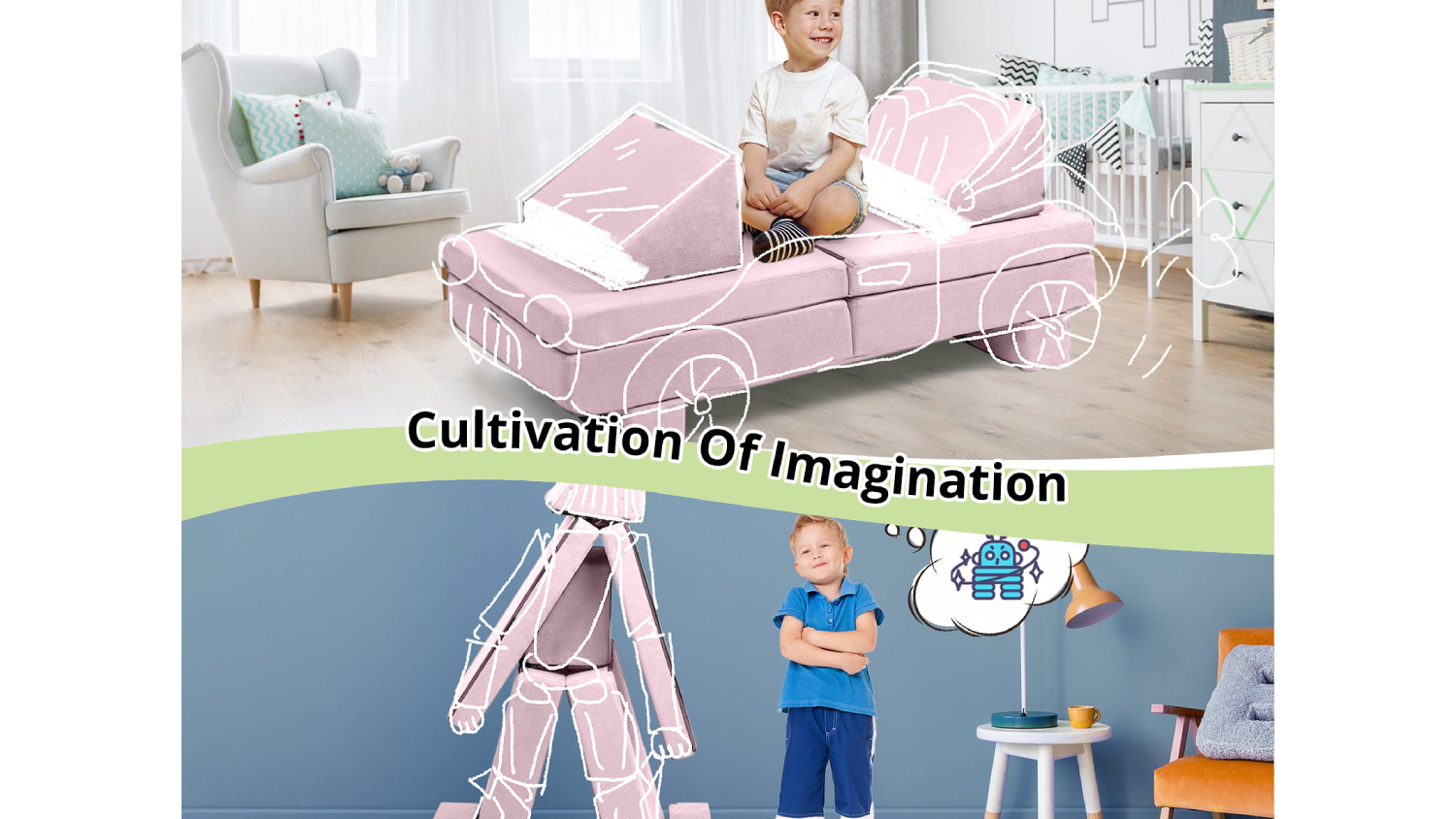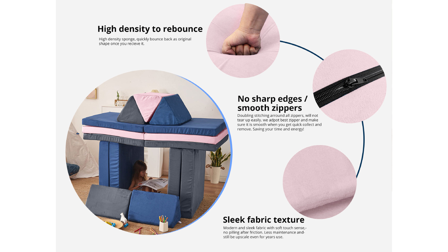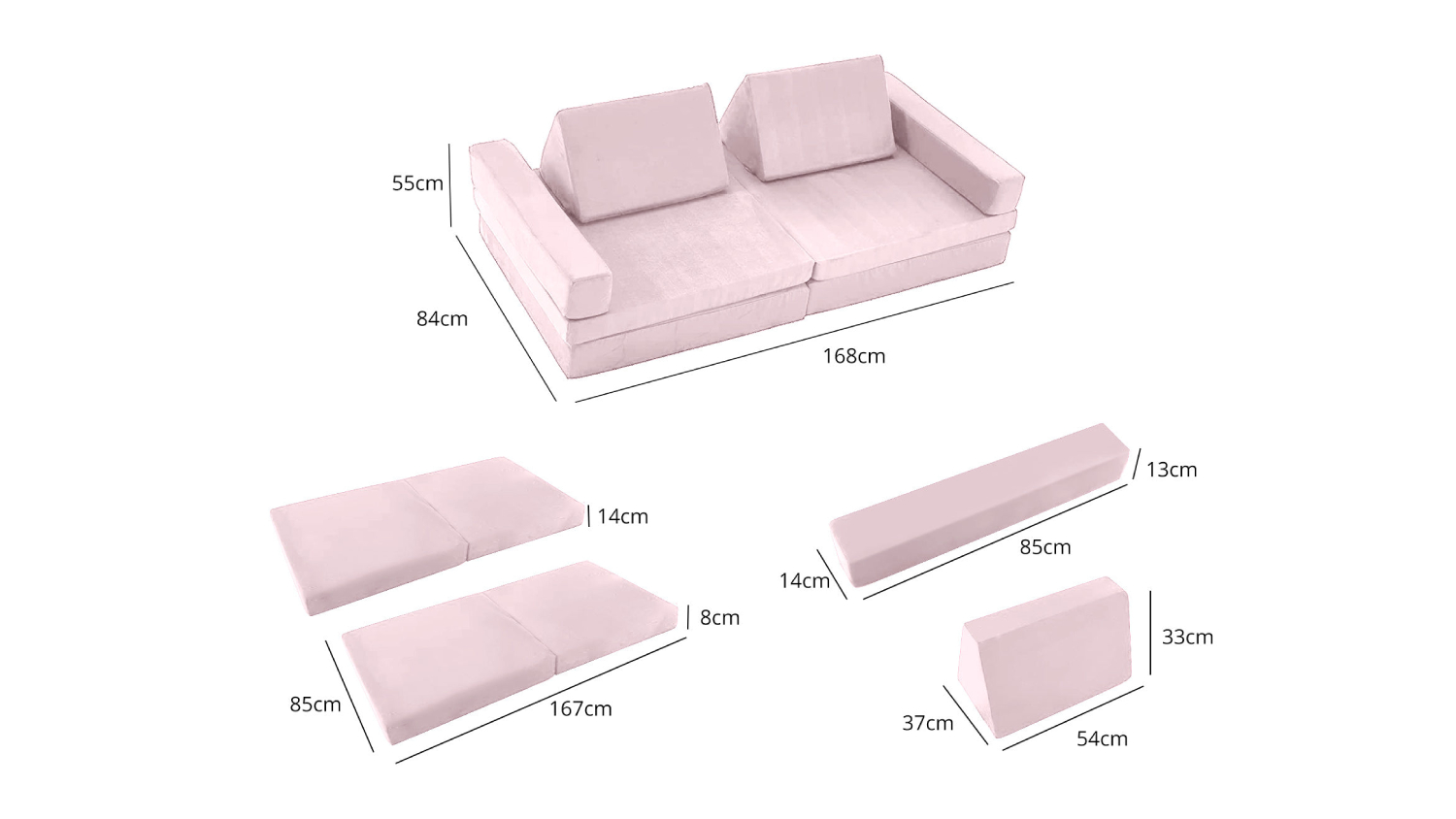 Make playtime extraordinary with the TSB Living Children's Play Couch! This modular play couch includes two foldable seats, two backrest cushions, and two triangle cushions that can be arranged into a fort, tunnel, or playhouse. Plus, it offers comfort and fun without any sharp edges!