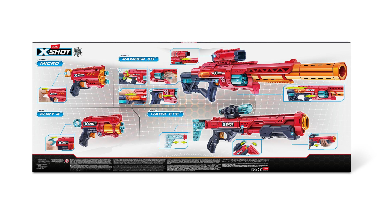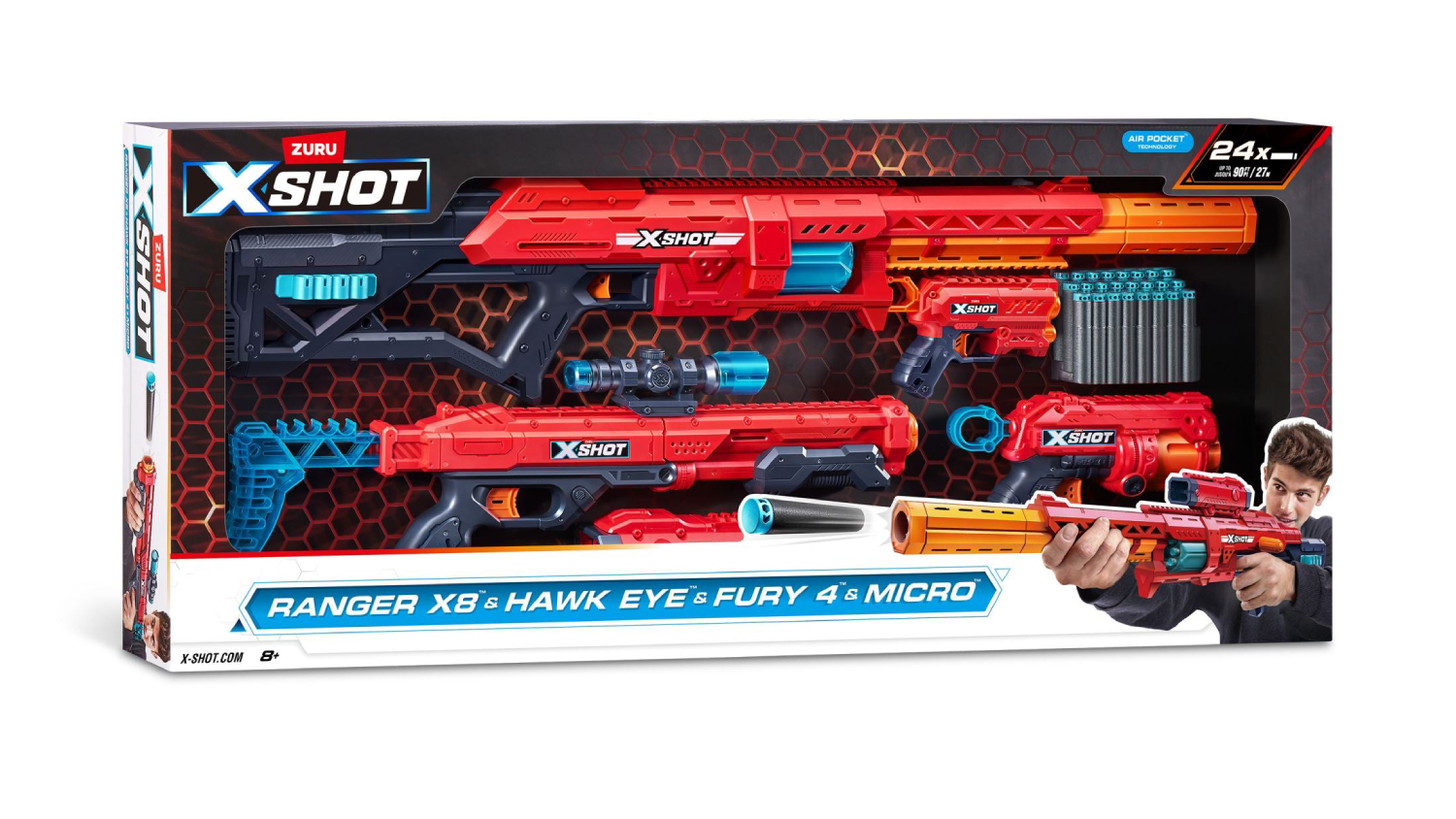 Gear up for non-stop action with the Zuru X-Shot EXCEL Dart Gun Combo Pack! This all-in-one set includes 4 different blasters and 24 Air Pocket Technology darts for maximum performance. Dominate the battlefield with the beastly 8-dart rotating barrel, hit targets up to 27 metres (90 feet) away, and enjoy precision shots with the detachable scope. From the pocket-sized Micro to the long-range Hawk Eye, this combo has everything you need for epic battles!