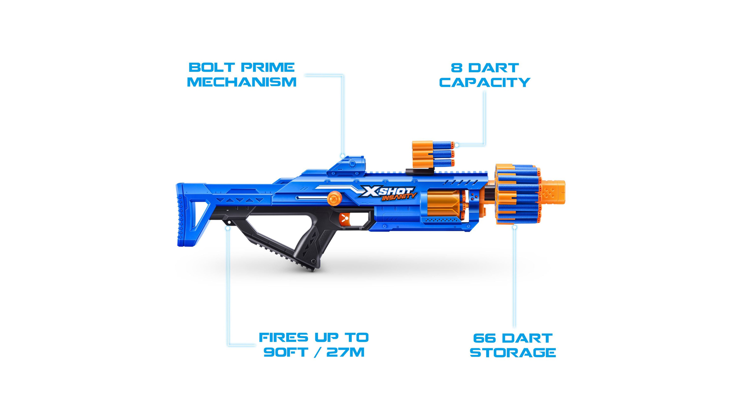 Dominate the battlefield with the Zuru X-Shot Insanity Bezerko Multi-Shot Dart Gun with Darts. This awesome blaster fires 8 darts in seconds via its rotating barrel and fast bolt-action priming mechanism. Its firing power reaches opponents up to 27 metres away with accurate Air Pocket Technology darts. The set also includes 84 darts and features an insane amount of dart storage to keep you locked and loaded for any competitive outdoor play.