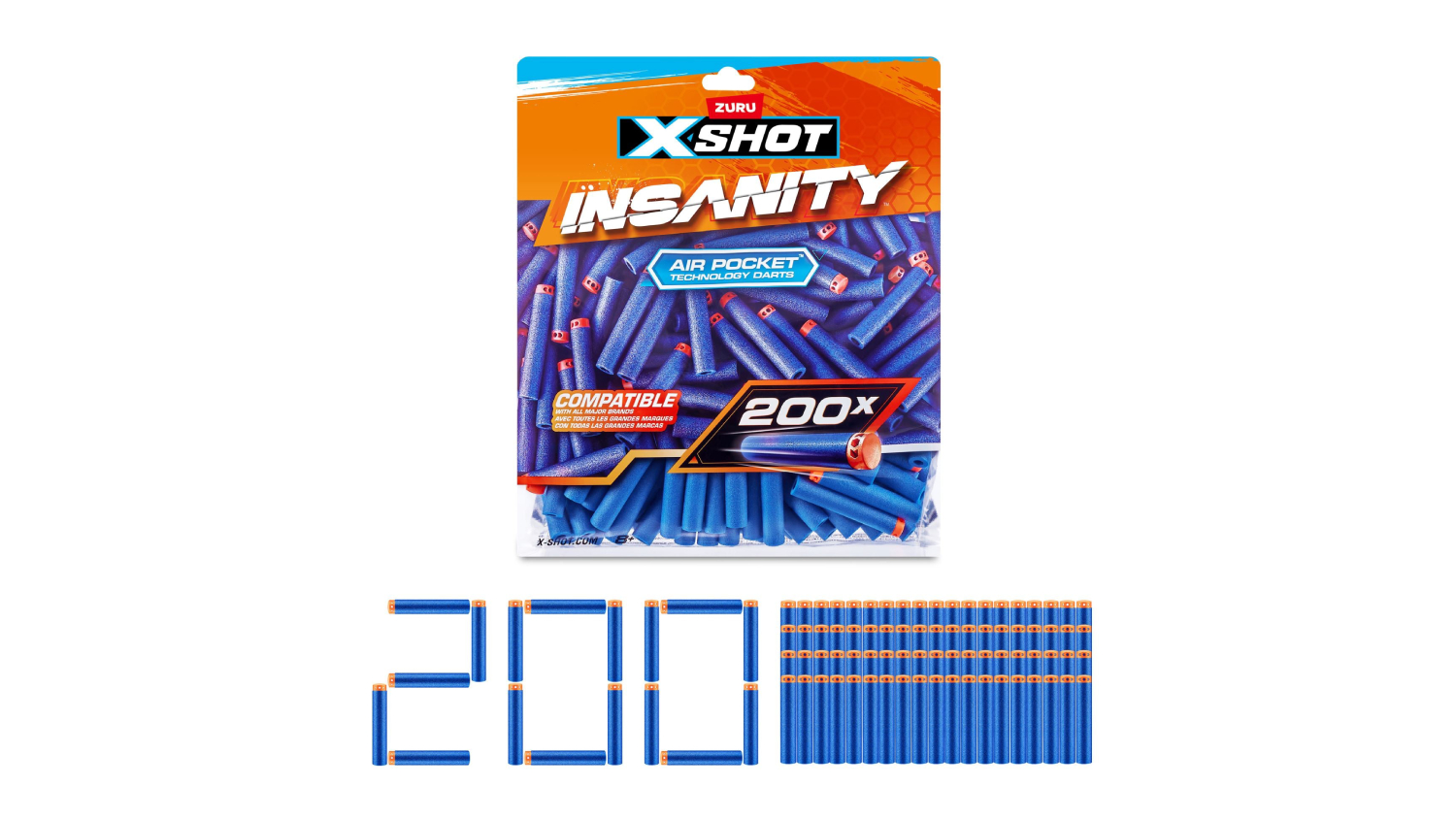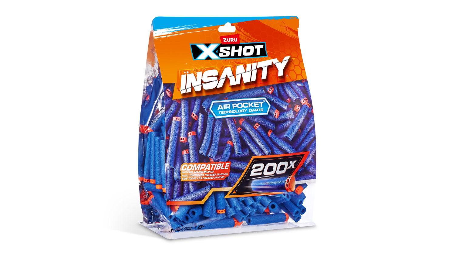 Load up with the Zuru X-Shot Insanity Foam Dart Refill Pack. These 200 darts use Air Pocket Technology to ensure every shot is faster, further, and more accurate. It is compatible with all X-Shot blasters and works with most major leading dart brands. The entire pack comes in a convenient resealable foil bag for super easy storage.