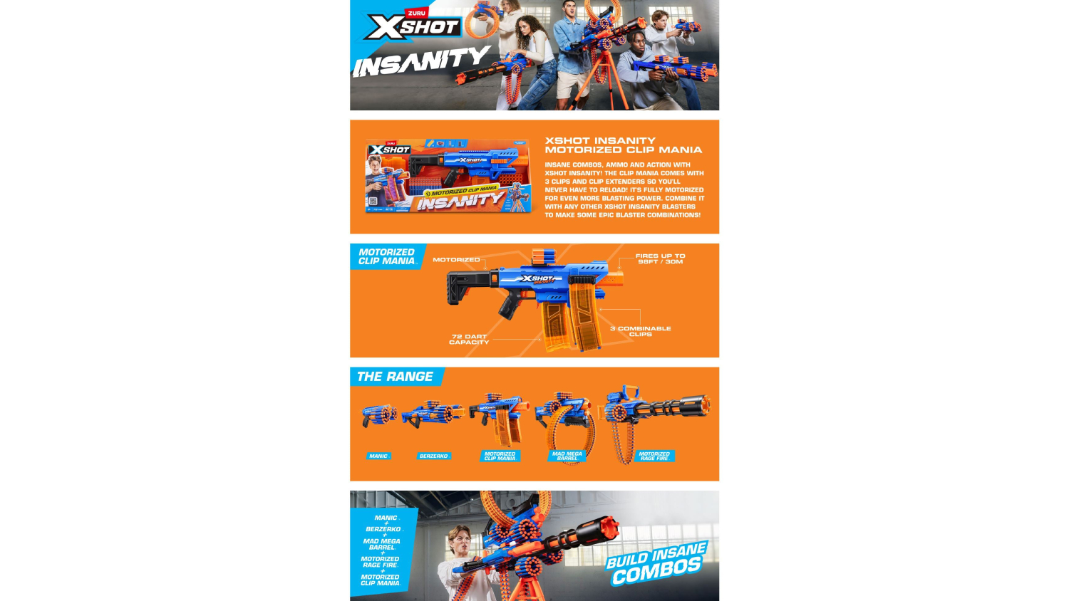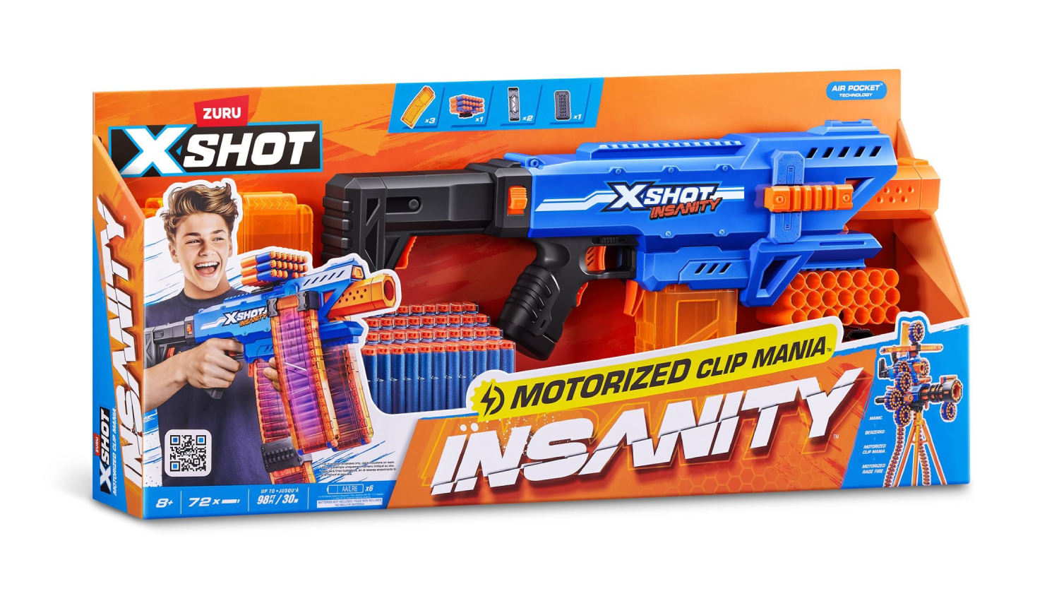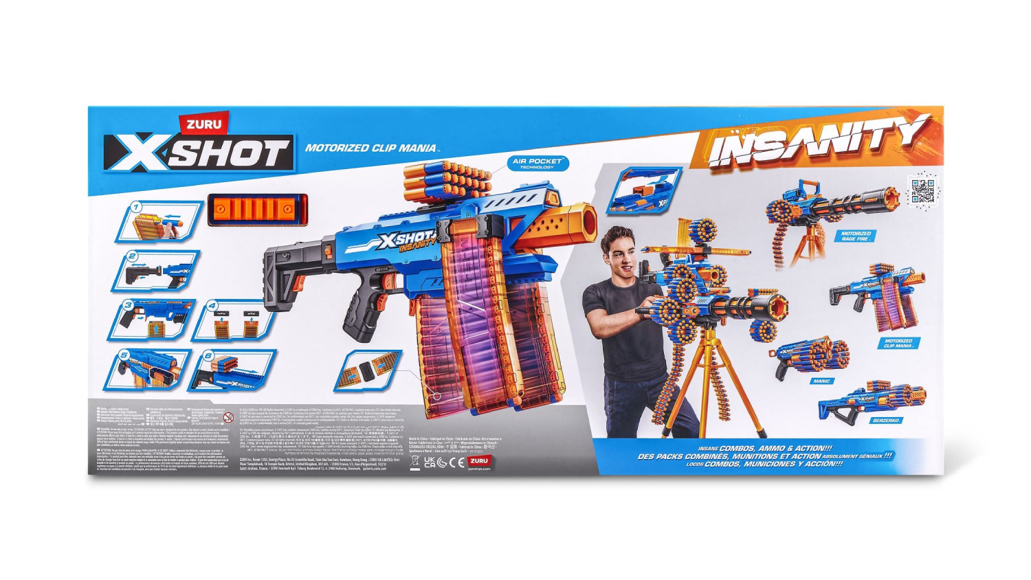 Meet the Zuru X-Shot Insanity Motorised Clip Mania Dart Gun—your ticket to rapid-fire domination! This motorised blaster packs 4 clips and extenders, so you can keep firing without missing a beat. Launch darts up to 90 feet away and customise your setup with insane accessories. Combine it with other X-Shot Insanity blasters for the ultimate battle rig.