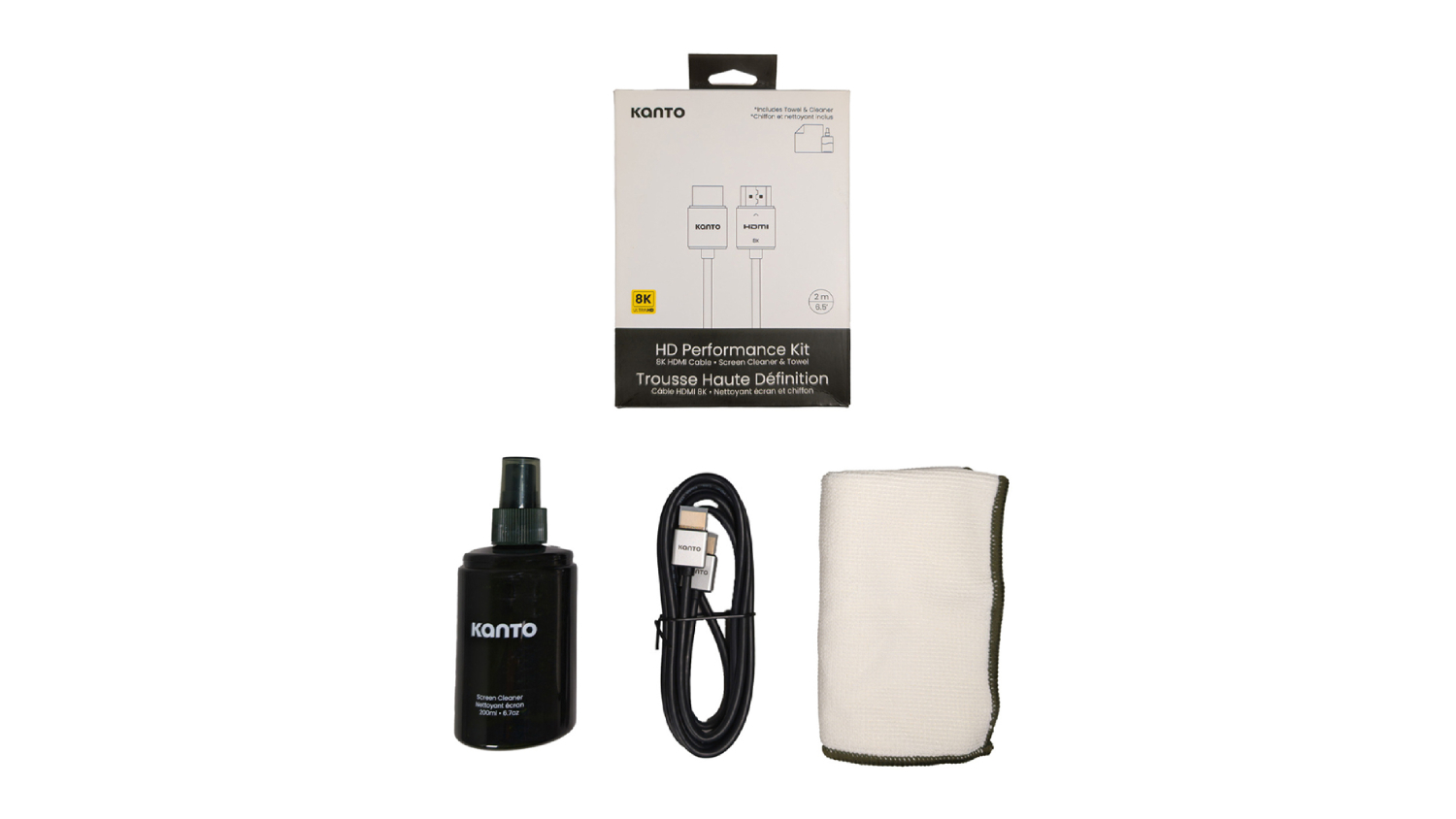 Level up your home entertainment experience with the Kanto HD Home Theatre Performance Kit. This bundle includes an HDMI 2.1 cable, delivering superior picture and sound quality. The durable, flexible cable is easy to install even in tight spaces, and the included screen cleaner safely refreshes your display. A microfibre towel and stylish spray bottle complete the set, making your home theatre setup cleaner, clearer, and more enjoyable.