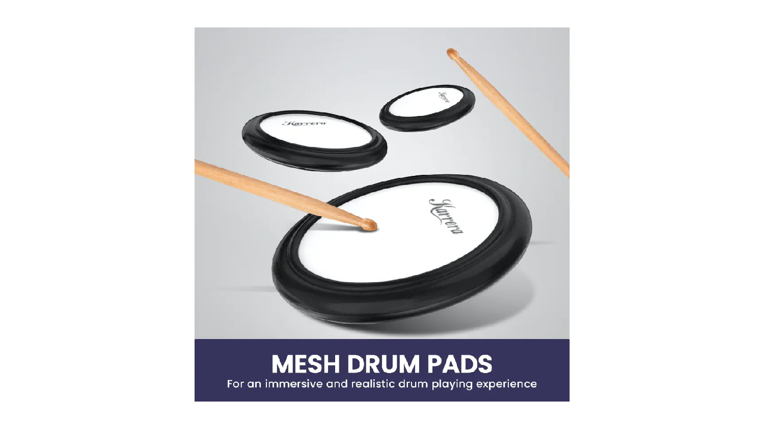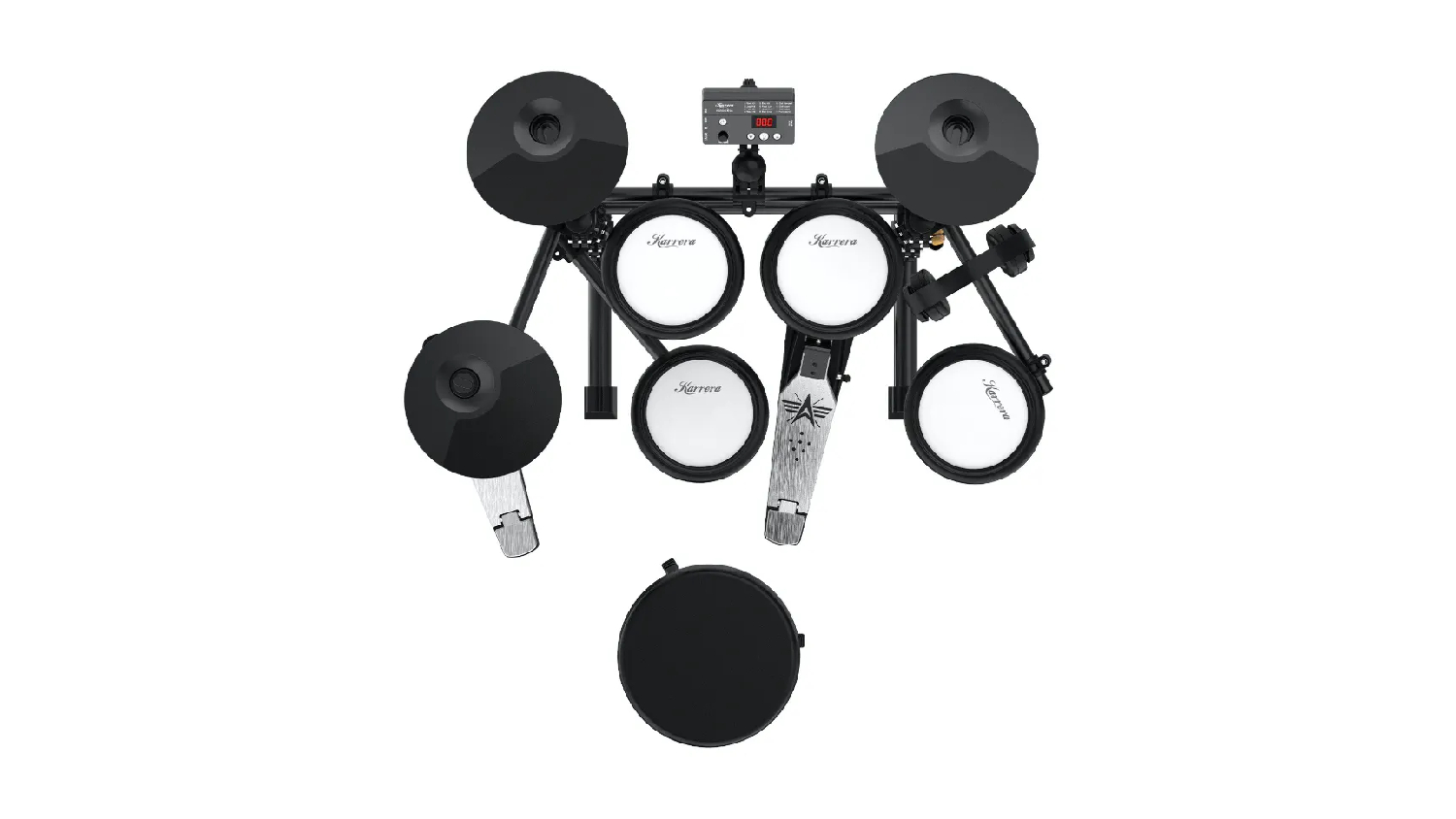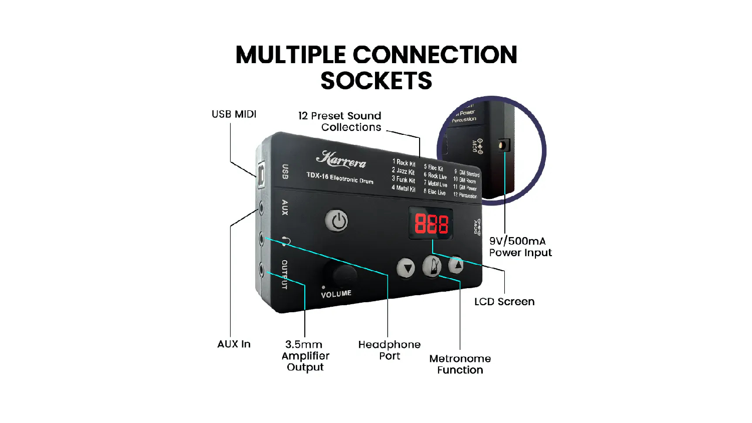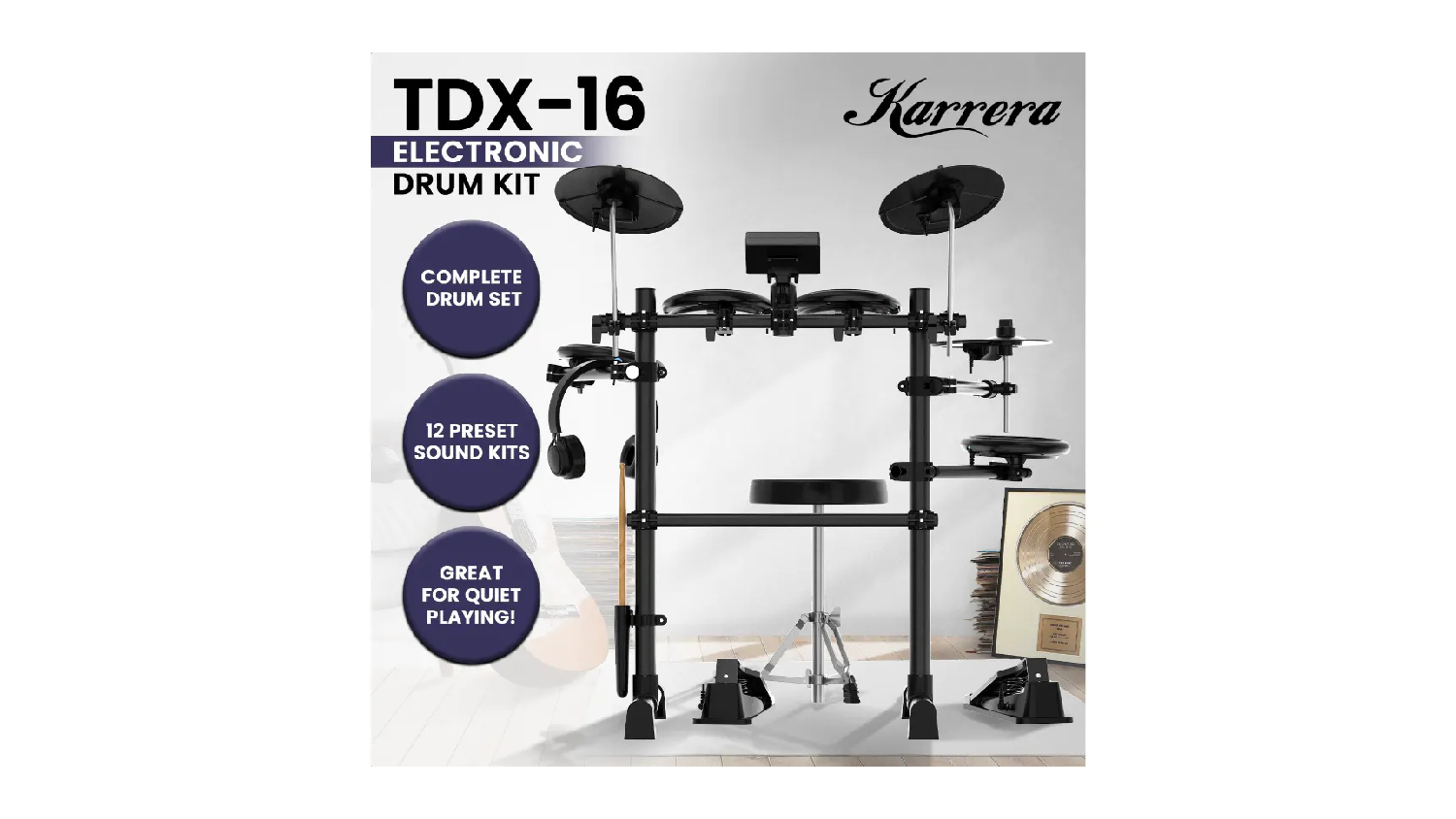 This Karrera TDX-16 Electronic Drum Kit w/ Pedals combines innovation, craftsmanship, and advanced features, it also includes 3 cymbals, Hi-hat and bass pedals, a virtual kick drum with pedal for realistic practice, LCD screen, USB MIDI connection, 3.5mm audio cable & amplifier output, and more. This Electronic Drum Kit will empower drummers of all levels to reach their full potential.