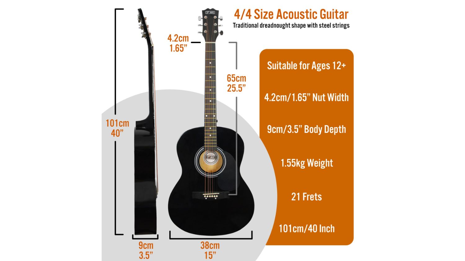 Ignite your musical passion with the 3rd Avenue Acoustic Guitar Premium Pack. This exquisite guitar is your gateway to musical excellence. Also packed with essential accessories like a gig bag with a zip pocket, spare strings, guitar picks, and more, it is suitable for budding musicians aged 11 and above.