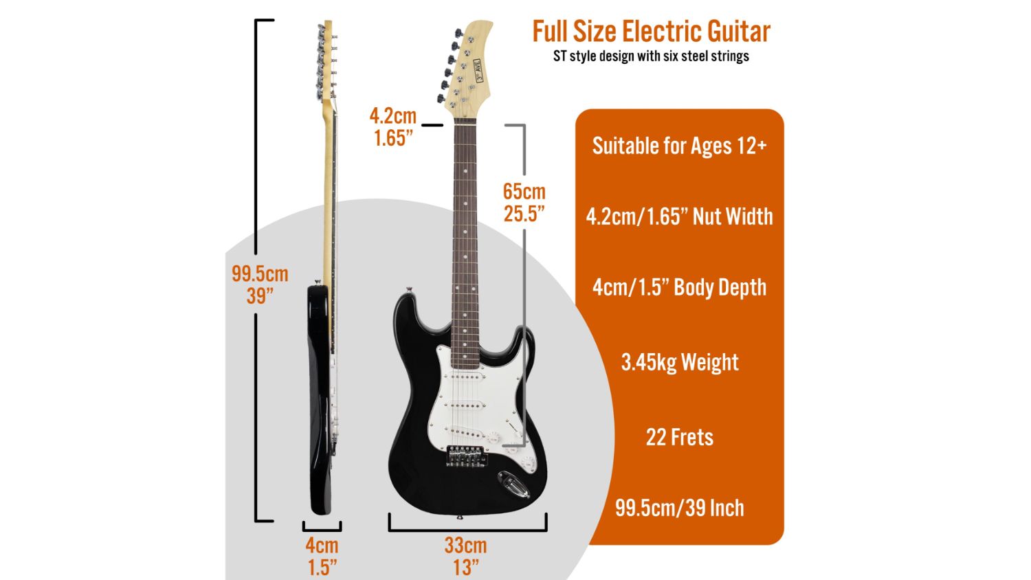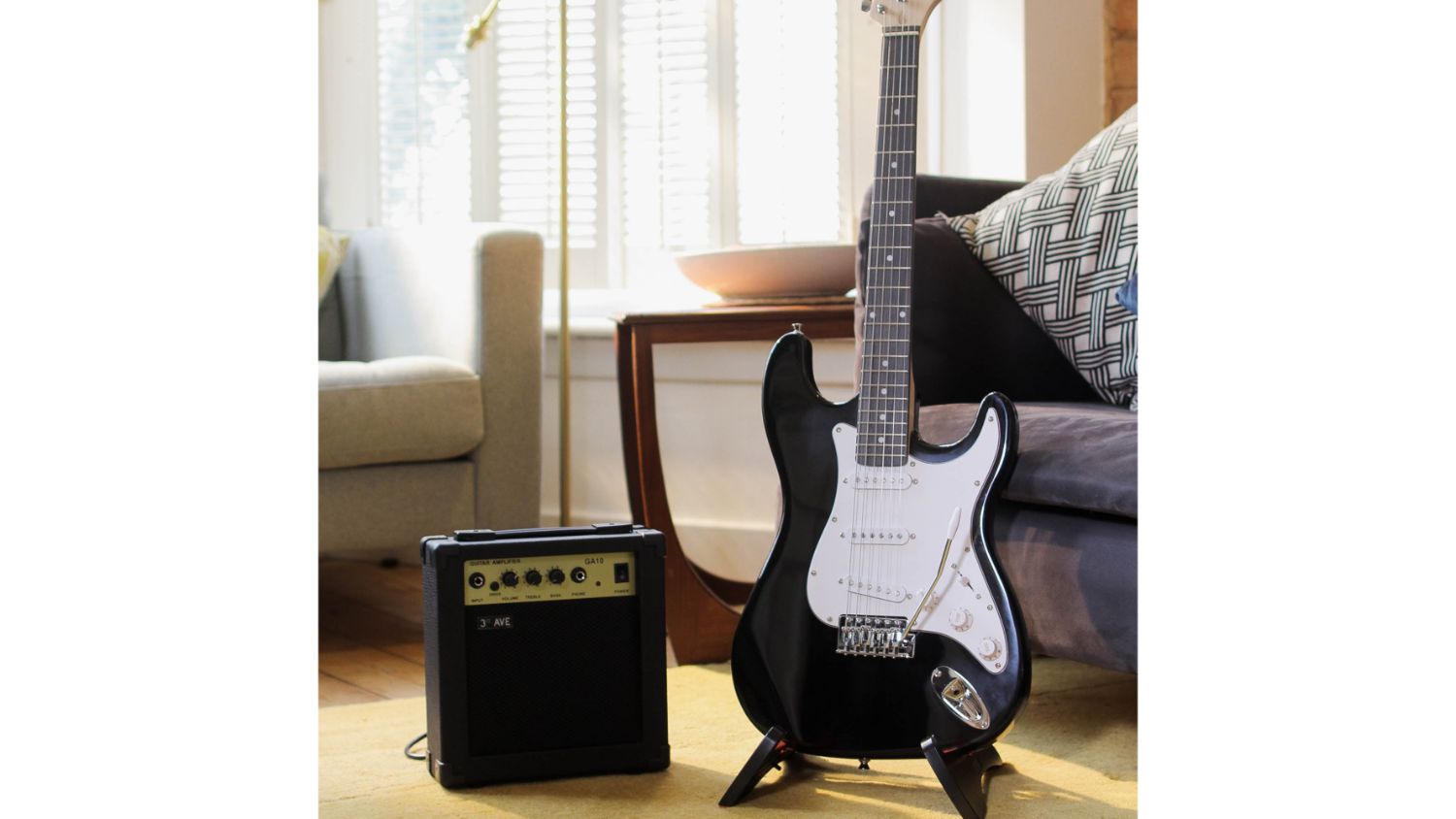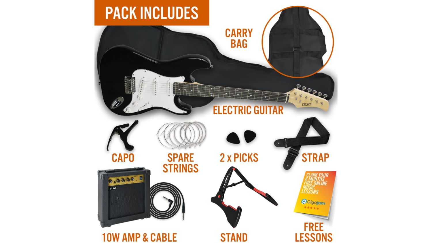 Unleash your inner rockstar with the 3rd Avenue Electric Guitar Deluxe Pack! This starter pack includes everything a beginner guitarist needs. The full-sized electric guitar boasts a timeless design with 22 frets, while a 10-watt amplifier ensures you can practice your riffs and melodies at home with clarity and power. Transport your guitar safely with the included gig bag, and keep the music flowing with spare strings, a capo, a guitar stand, a strap, picks, and cable.