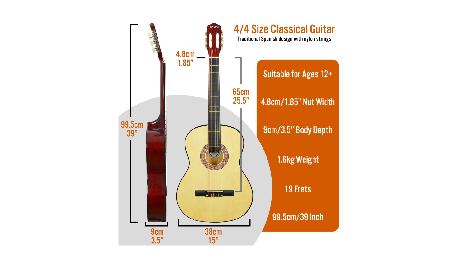 Music is a language that speaks to the soul, and your journey begins right here. The 3rd Avenue full-size Classical Guitar starter pack is your passport to a world of melodies. This bundle features a full-size guitar ideal for ages 11 years and up. It also comes with essential accessories like a gigbag and spare strings.