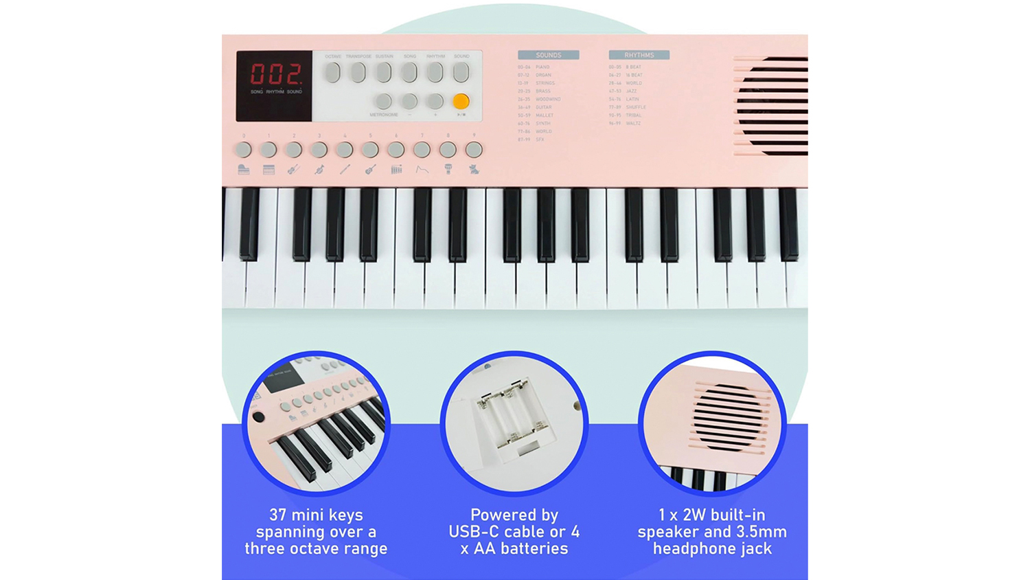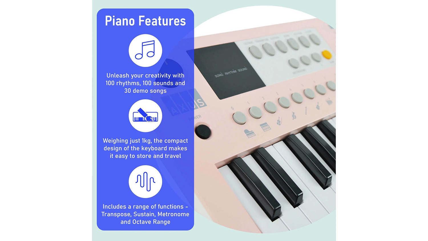 Start your musical adventure anywhere with the Axus Mini Electric Keyboard 37 Key. Dive into a world of musical possibilities with its extensive collection of 100 sounds and 100 rhythms, supported by practical features like adjustable tempo and 32-note polyphony. Power it via USB-C or batteries and take your musical journey with you.