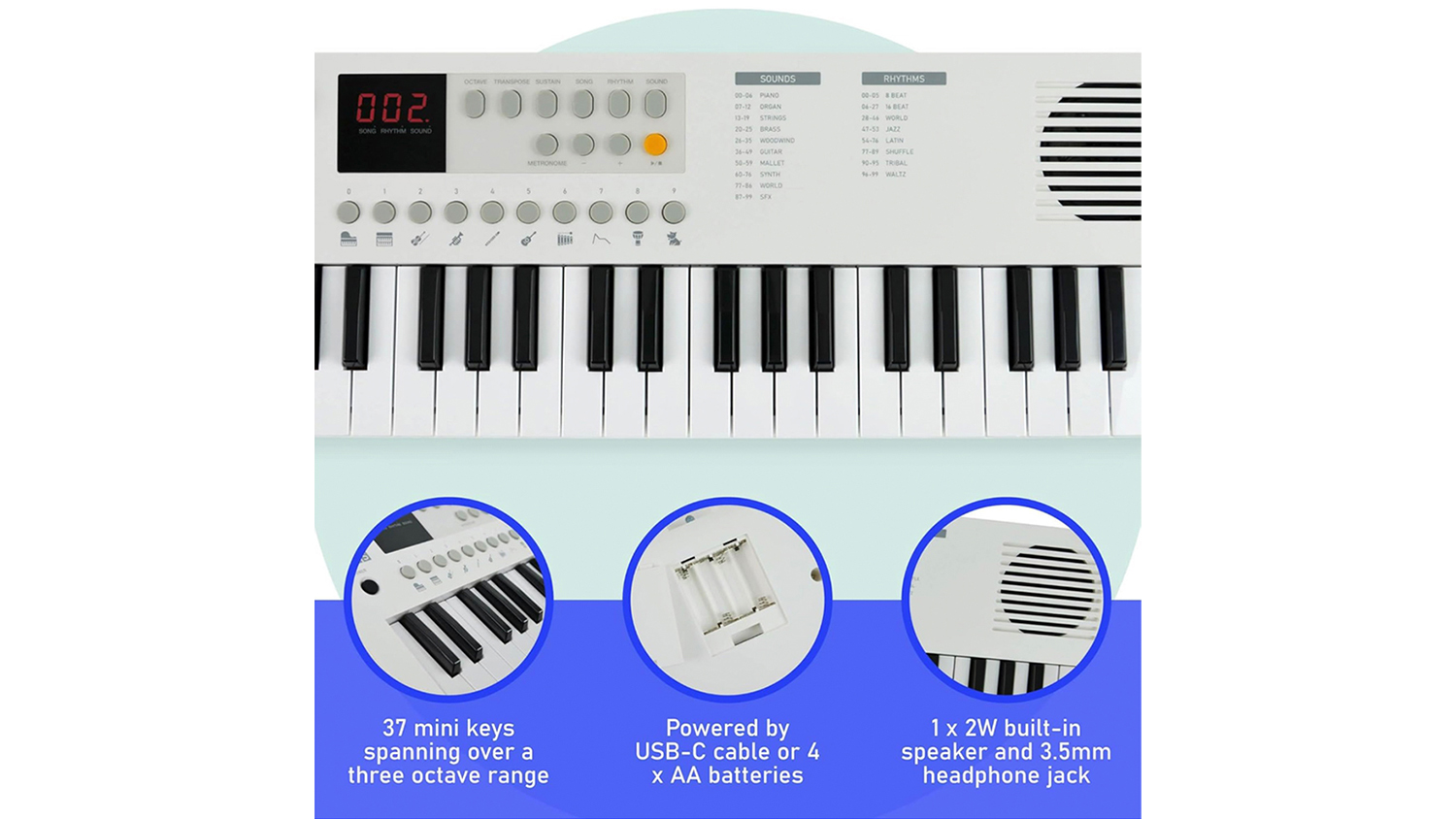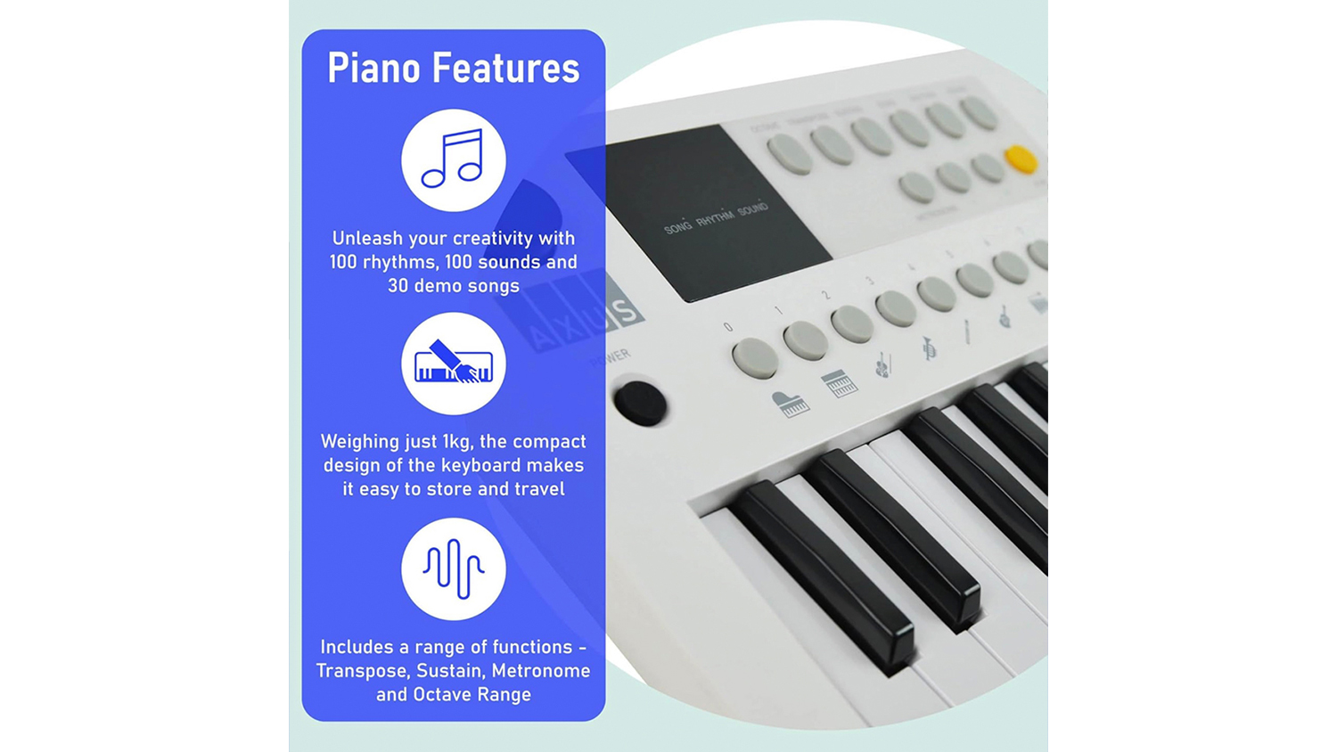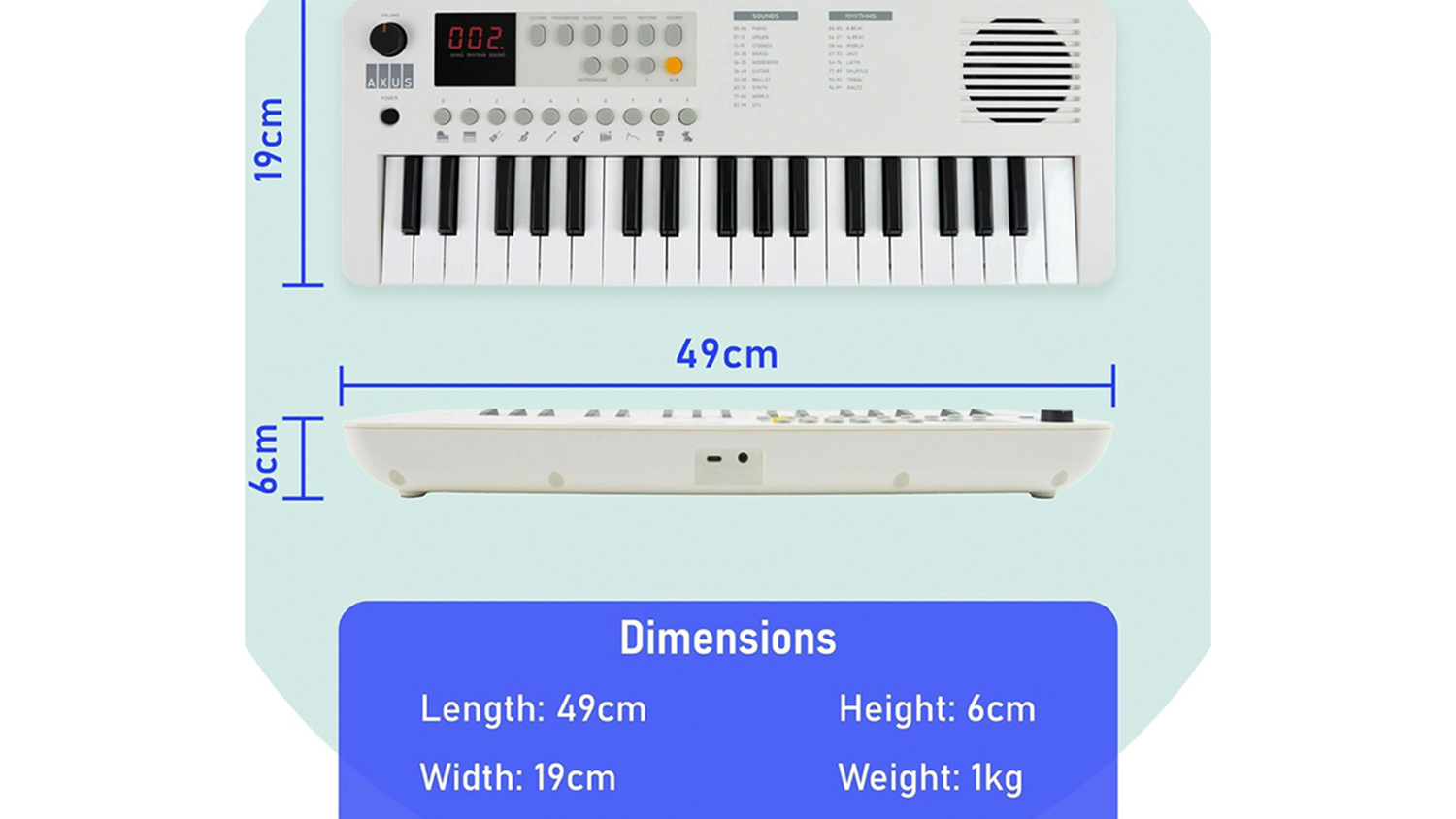 Start your musical adventure anywhere with the Axus Mini Electric Keyboard 37 Key. Dive into a world of musical possibilities with its extensive collection of 100 sounds and 100 rhythms, supported by practical features like adjustable tempo and 32-note polyphony. Power it via USB-C or batteries and take your musical journey with you.