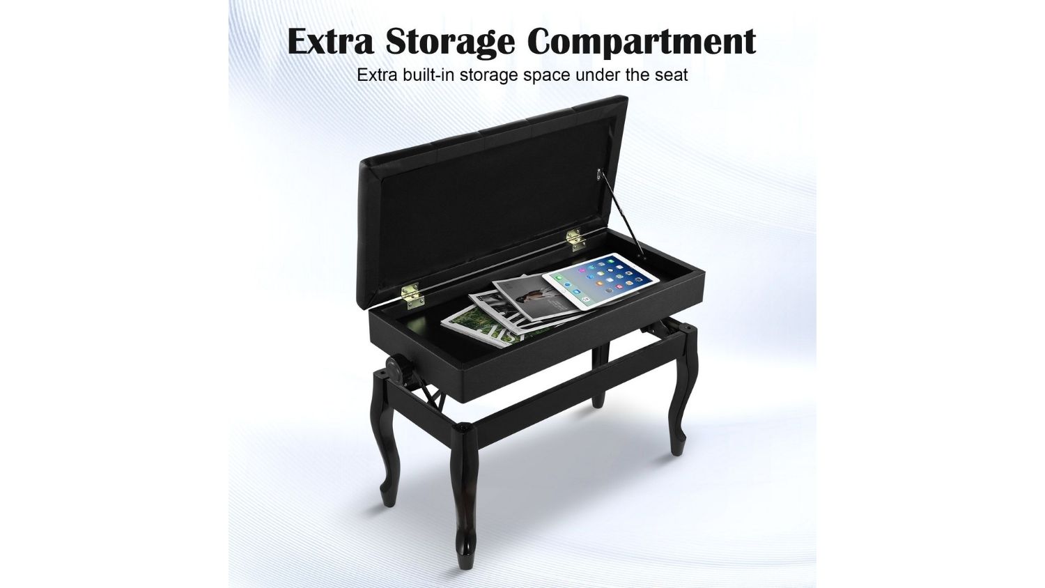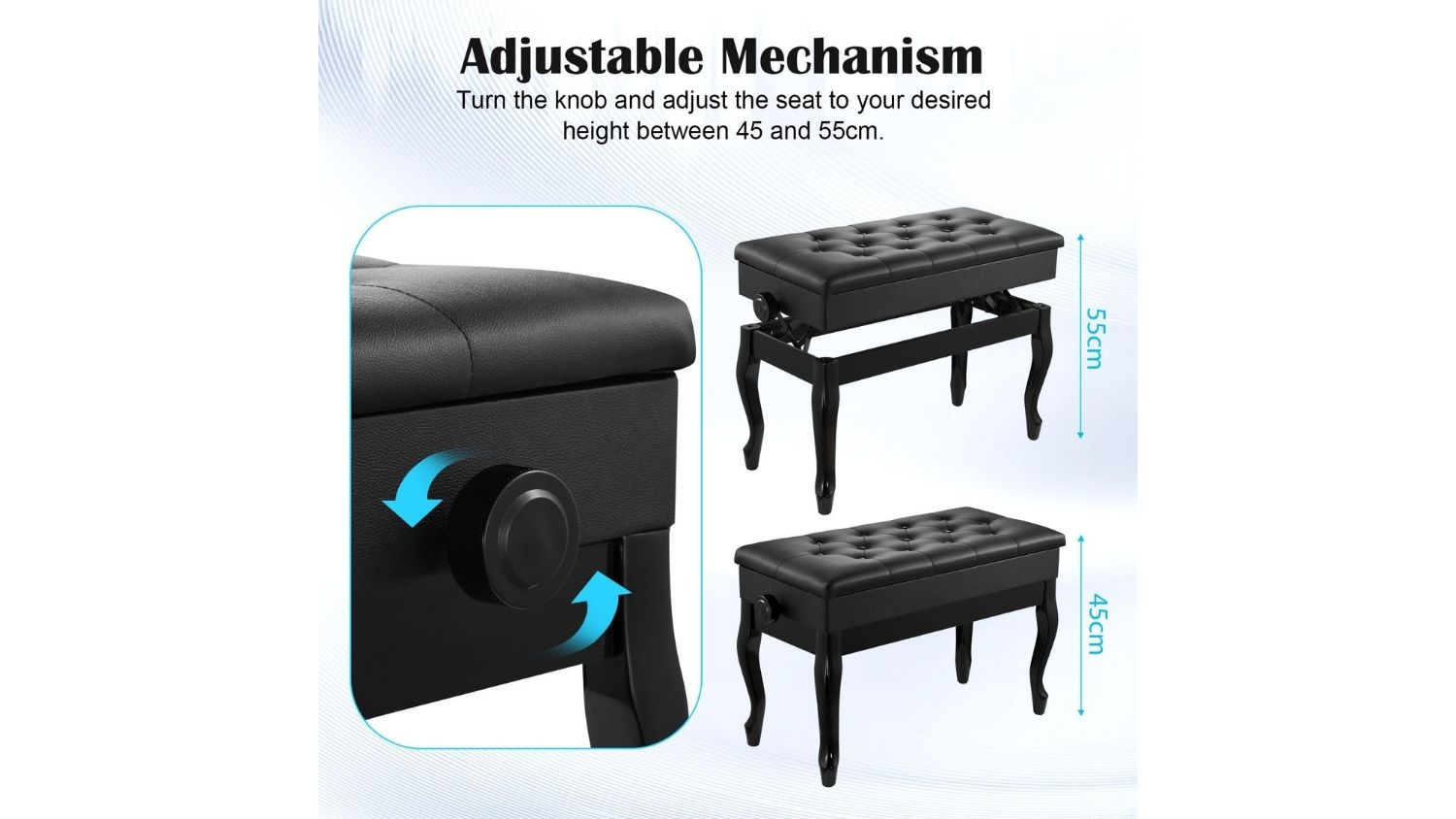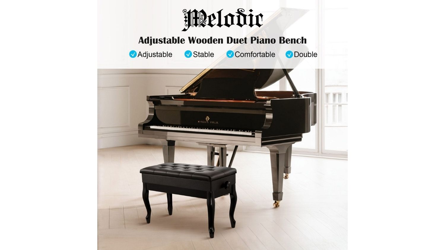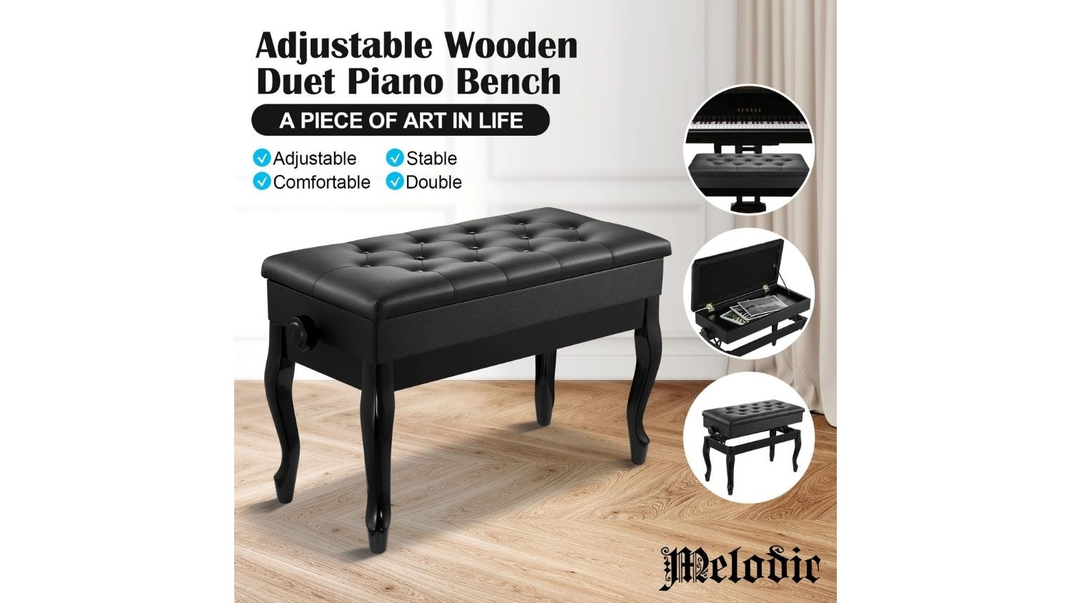 The Melodic Adjustable Wooden Piano Stool is a practical and stylish seating solution for both professional performers and home musicians. Featuring a large double seat, solid wood construction, and a cushioned PU leather top, it delivers comfort and durability in one elegant design. The non‑slip foot pads protect your floors, while the safety-hinged lid reveals a hidden storage space for books and music. Versatile by nature, this adjustable stool also fits perfectly in bedrooms, living rooms, or entryways.