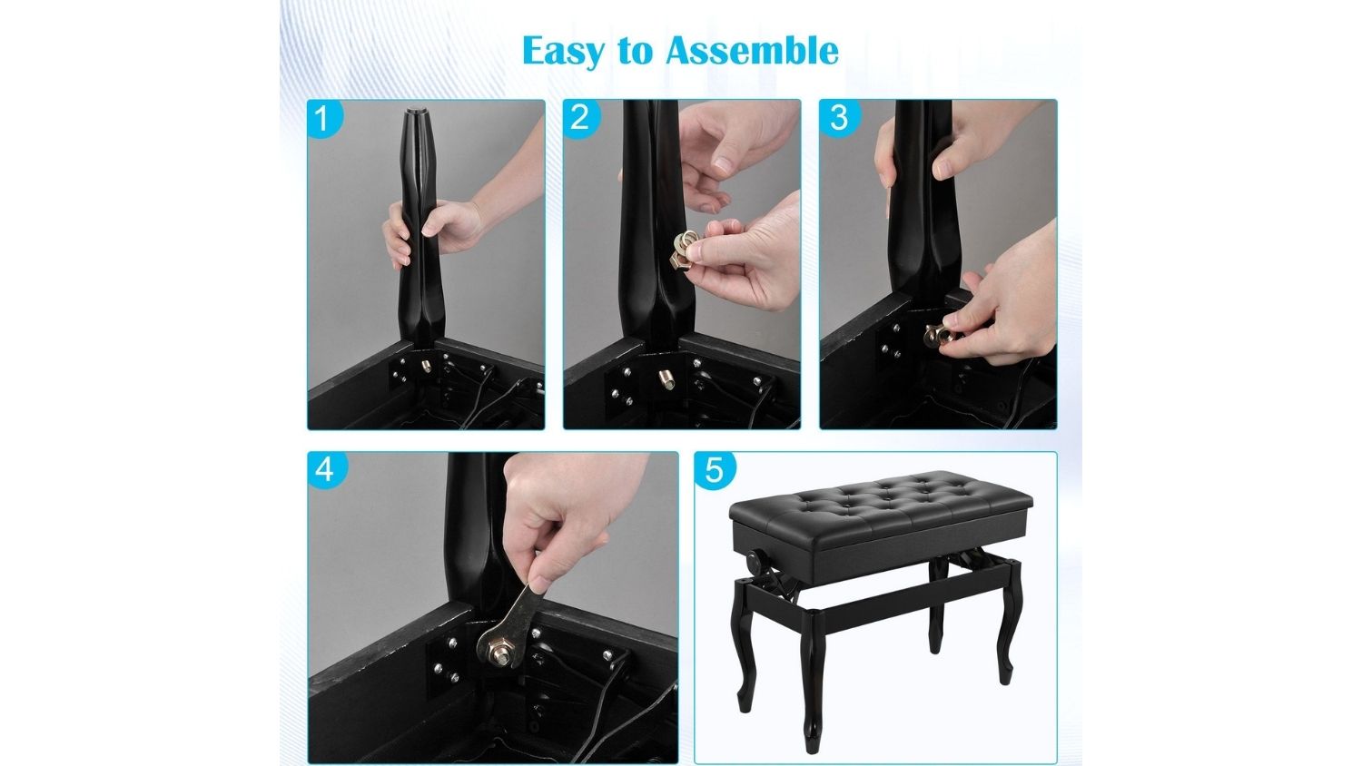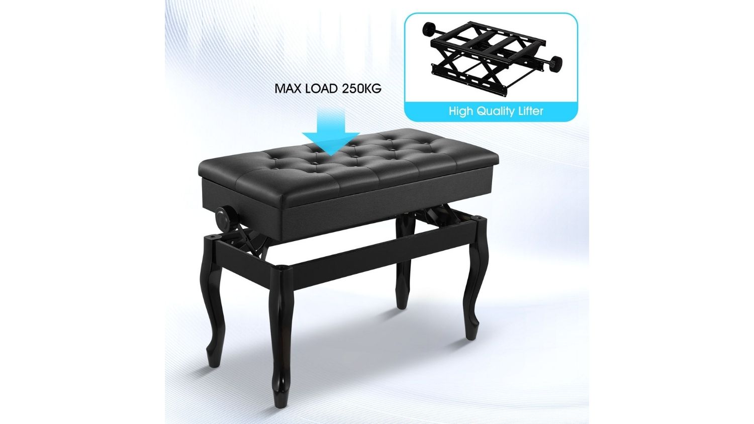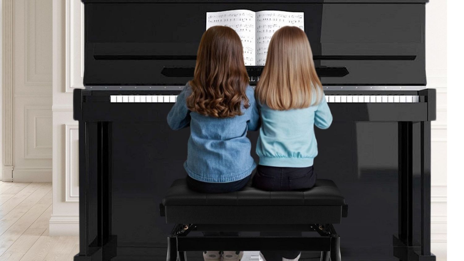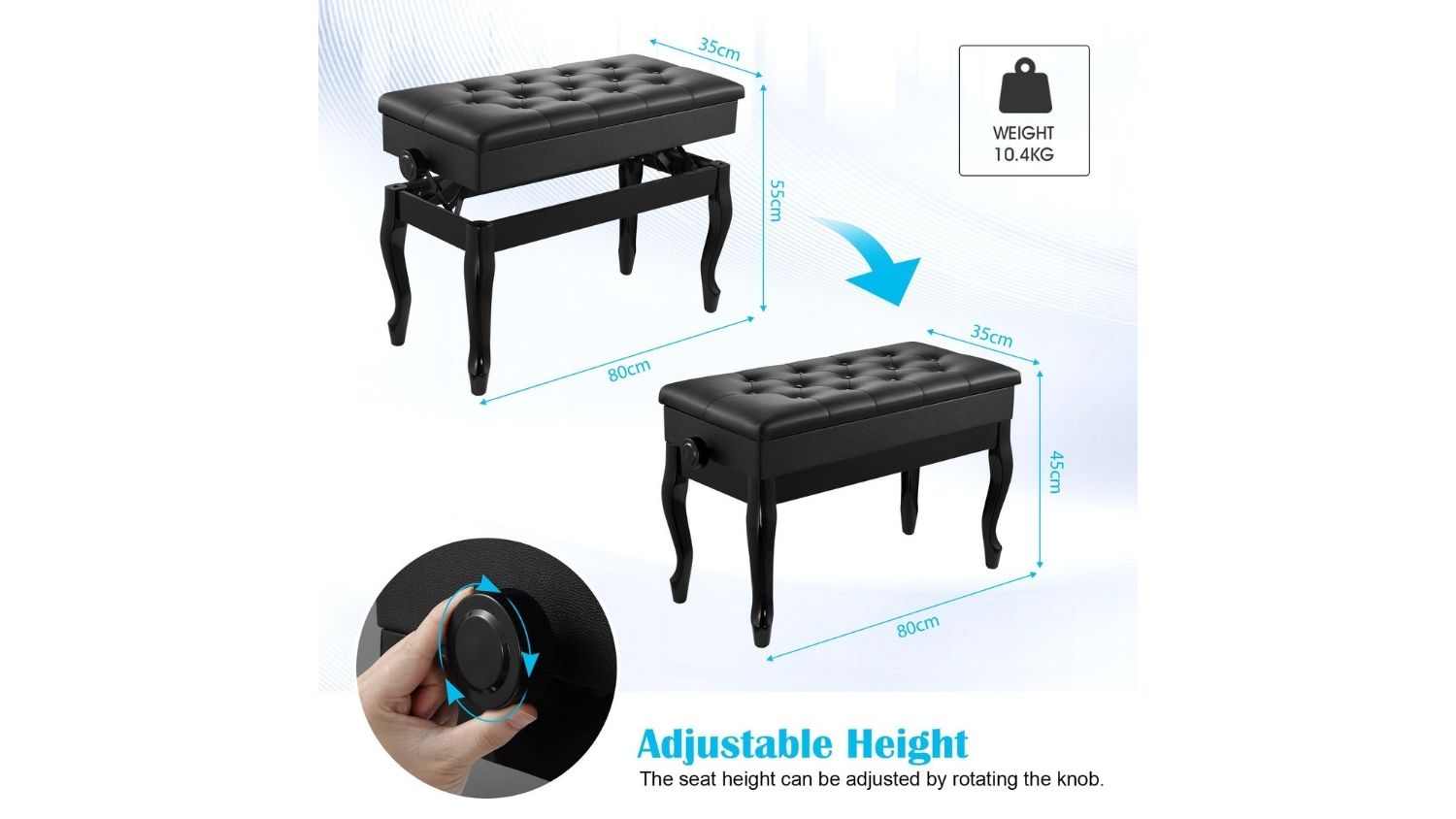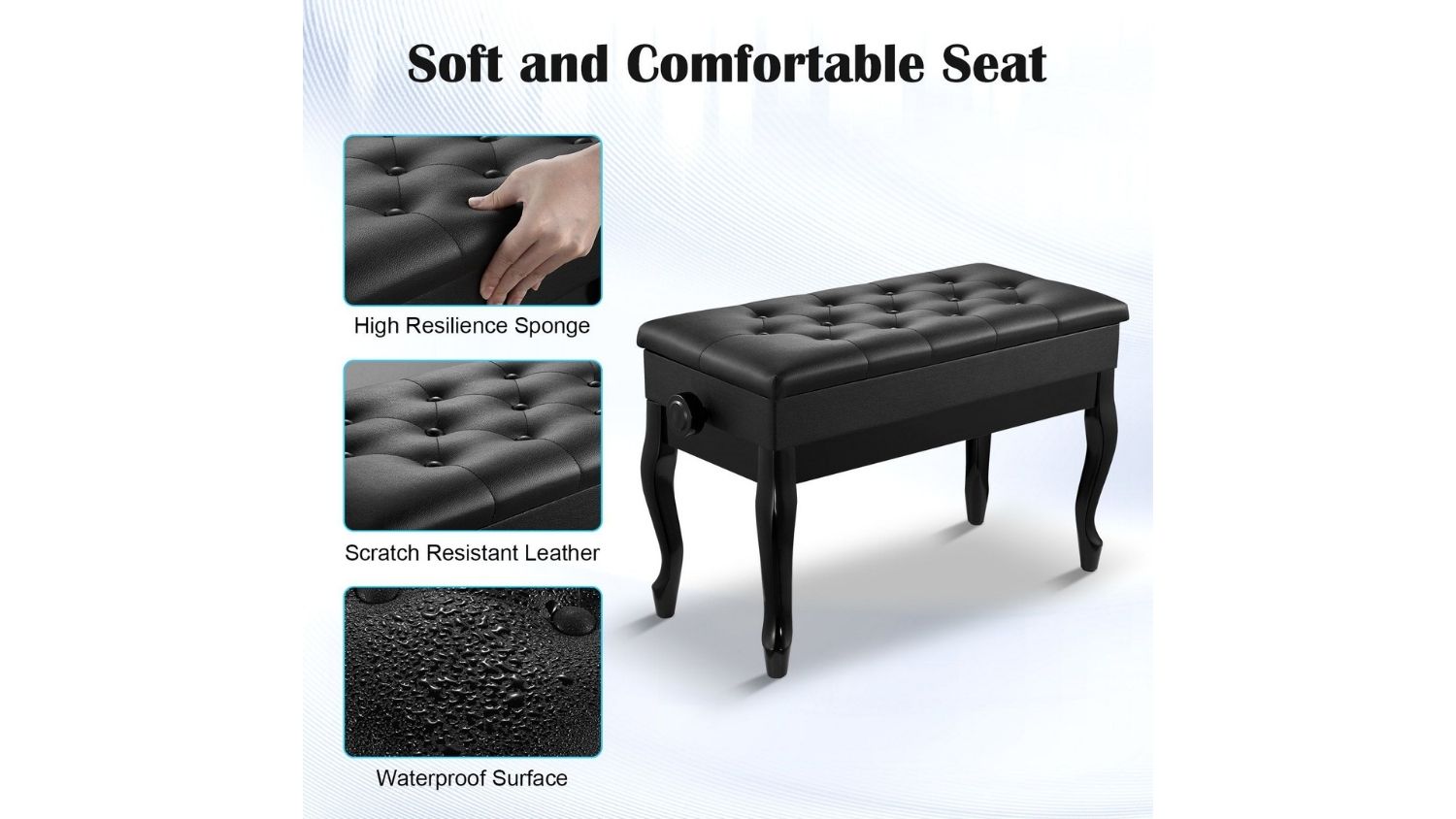The Melodic Adjustable Wooden Piano Stool is a practical and stylish seating solution for both professional performers and home musicians. Featuring a large double seat, solid wood construction, and a cushioned PU leather top, it delivers comfort and durability in one elegant design. The non‑slip foot pads protect your floors, while the safety-hinged lid reveals a hidden storage space for books and music. Versatile by nature, this adjustable stool also fits perfectly in bedrooms, living rooms, or entryways.