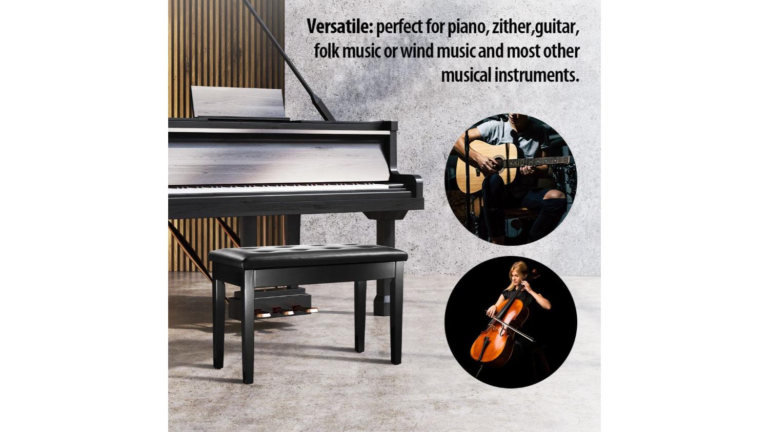 Blending style and function, the Melodic Piano Bench Stool with Storage is a must-have for musicians. Its all-black design features a durable wood frame, padded leather seat, and hidden storage space for music sheets or essentials. Strong enough to hold up to 200kg, it’s perfect for pianists, keyboard players, or as a versatile piece of home décor.