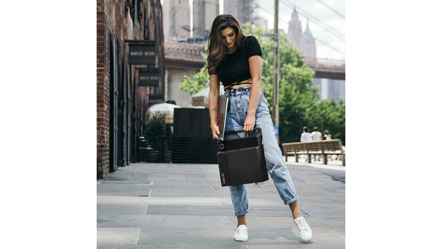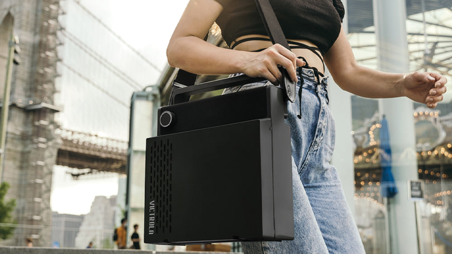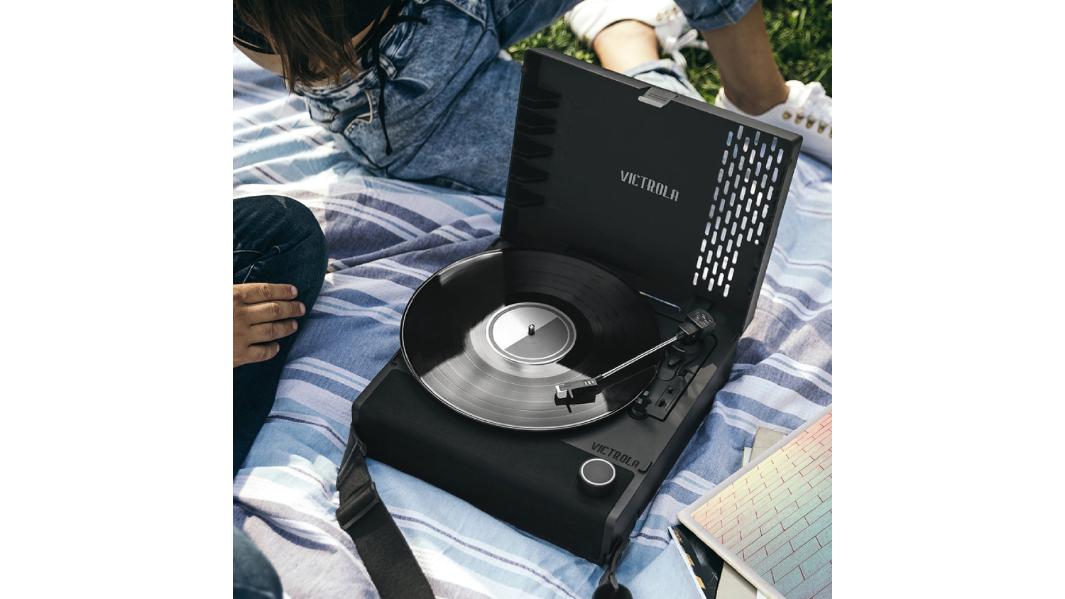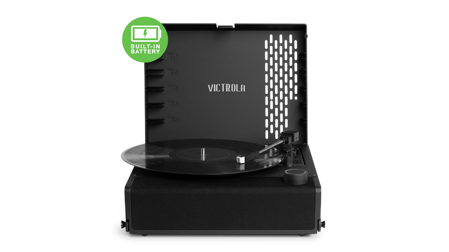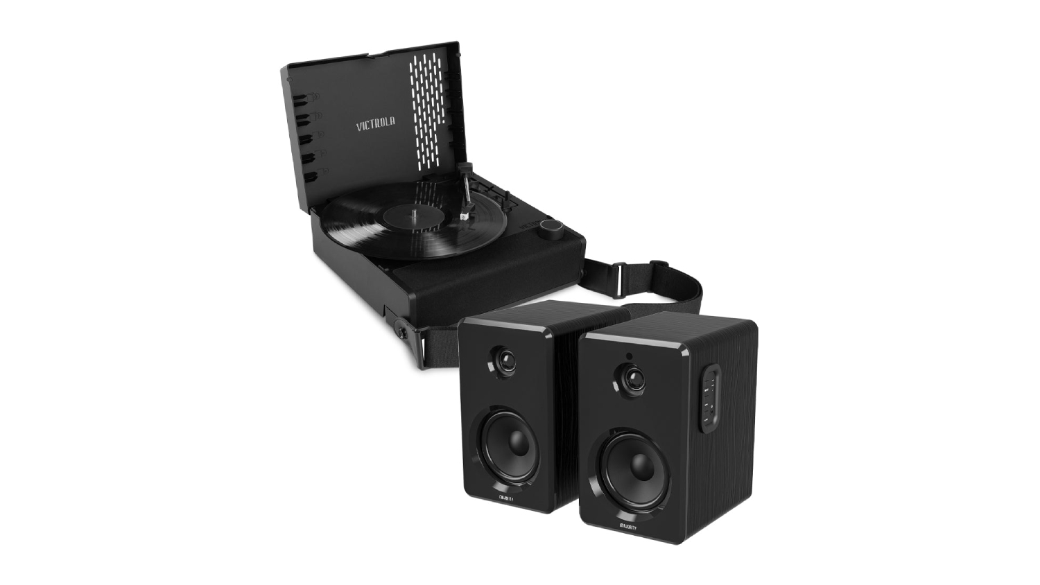 Play your favourite vinyl records on demand with the Victrola Revolution GO Portable Turntable Black and Majority D40 Bluetooth Speakers Bundle! Built with a 3-speed belt-driven turntable and an Audio Technica moving magnetic cartridge, this unit delivers superior sound quality. It also boasts a battery-powered design, so you can enjoy your collection wherever you go. You can also enjoy crystal-clear audio for movies, music, and more with the bundled Majority D40 Speakers, featuring Bluetooth, USB, and AUX-in.