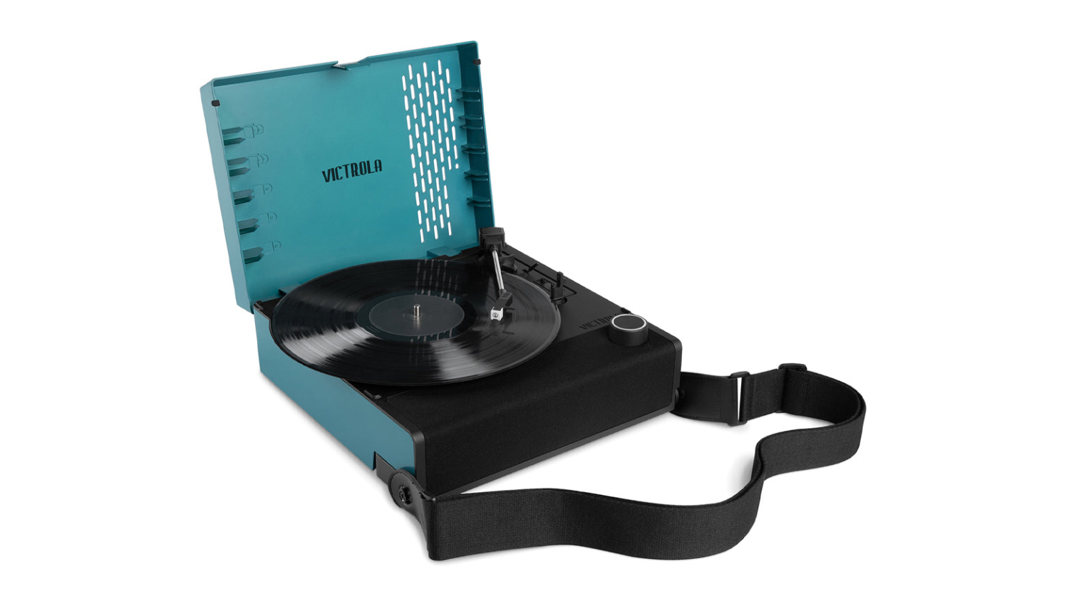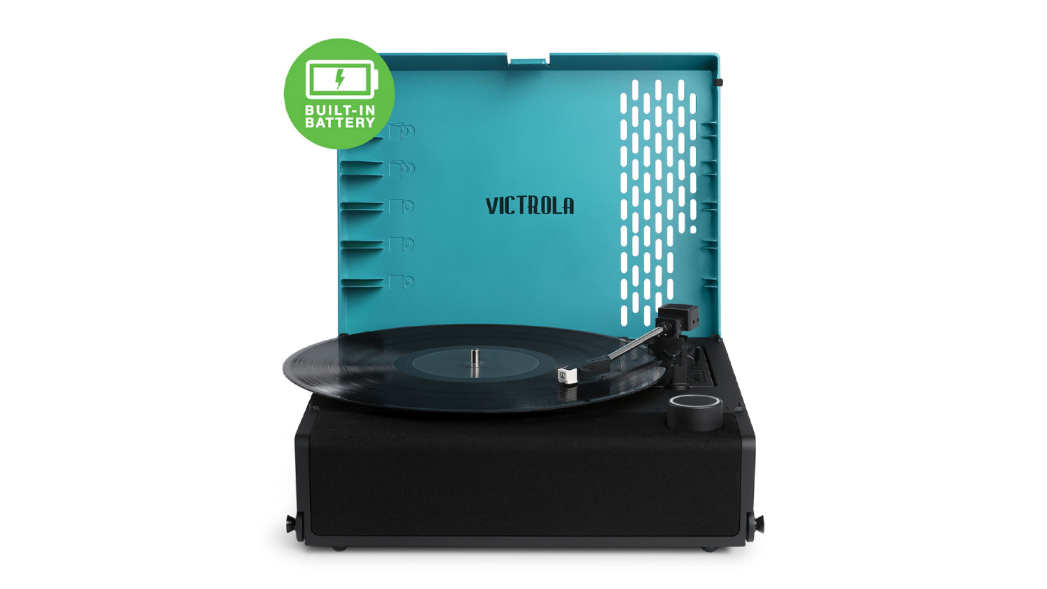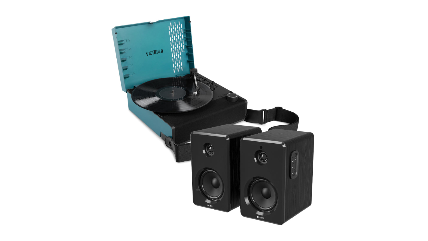 Play your favourite vinyl records on demand with the Victrola Revolution GO Portable Turntable Blue and Majority D40 Bluetooth Speakers Bundle! Built with a 3-speed belt-driven turntable and an Audio Technica moving magnetic cartridge, this unit delivers superior sound quality. It also boasts a battery-powered design, so you can enjoy your collection wherever you go. You can also enjoy crystal-clear audio for movies, music, and more with the bundled Majority D40 Speakers, featuring Bluetooth, USB, and AUX-in.