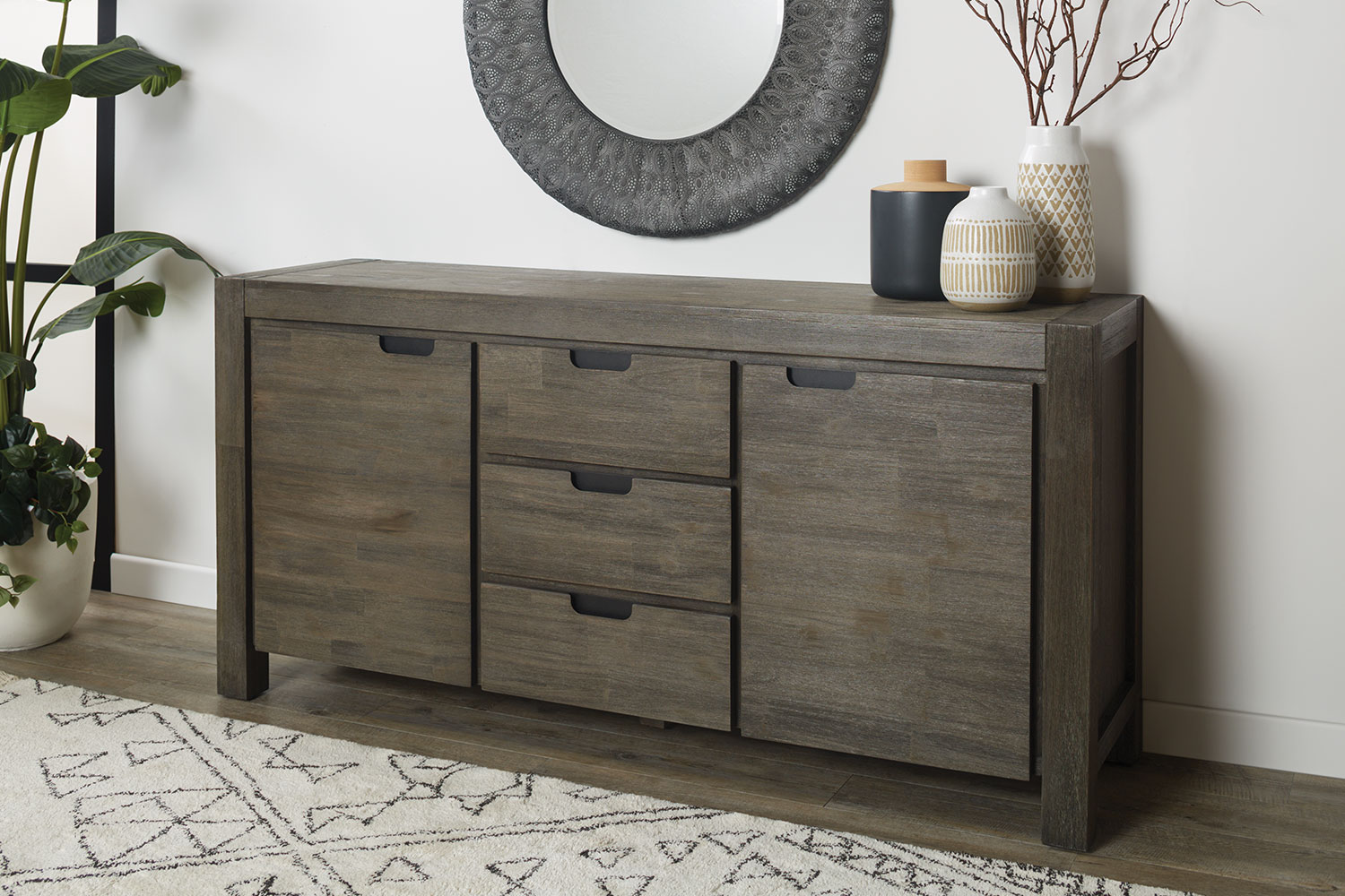 Organise your dining essentials in style with the Kuta Buffet! Crafted from durable Acacia wood, this statement piece adds a rustic look to your dining space. It also offers practical storage options with two doors, three shelves, and a beautiful tabletop.