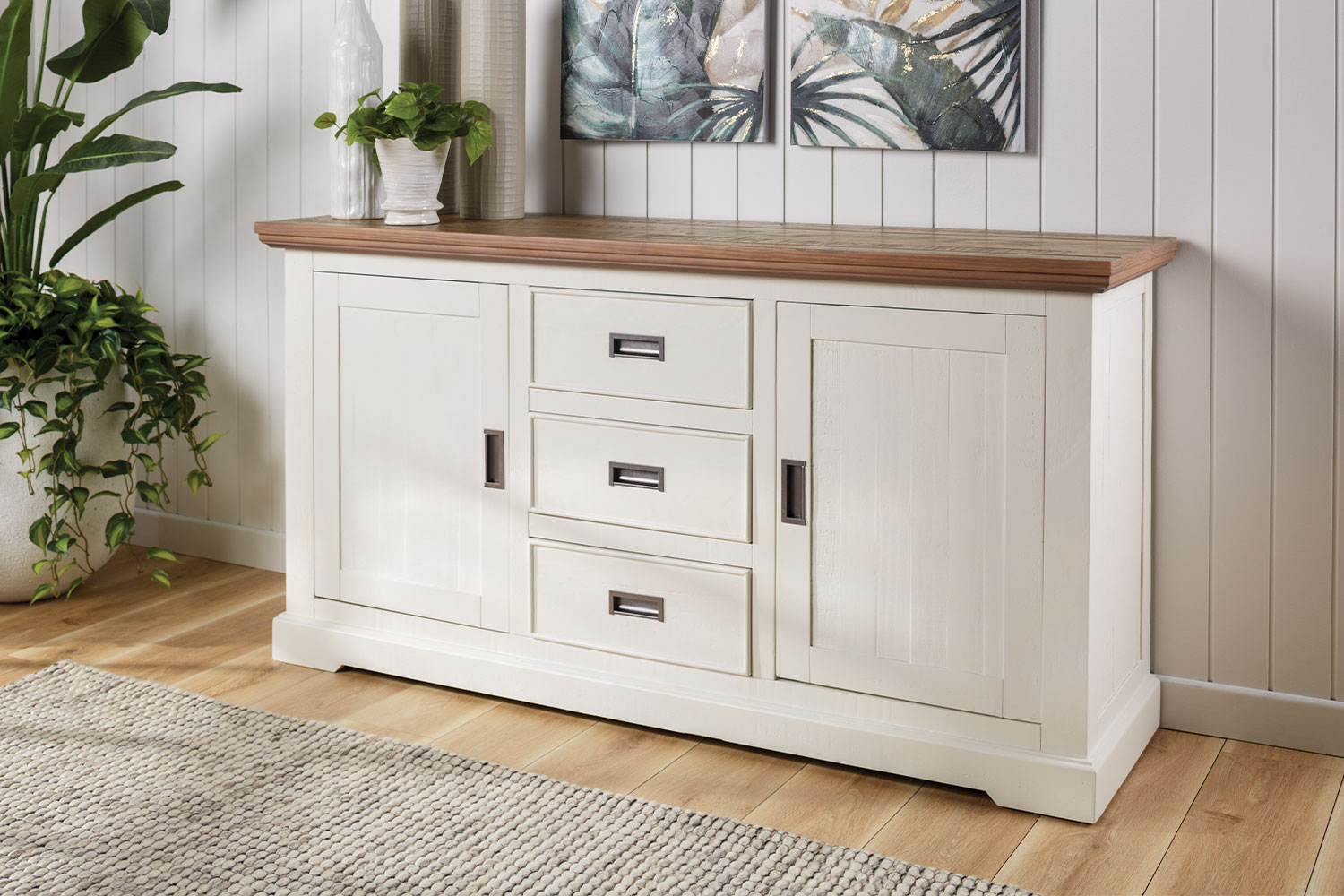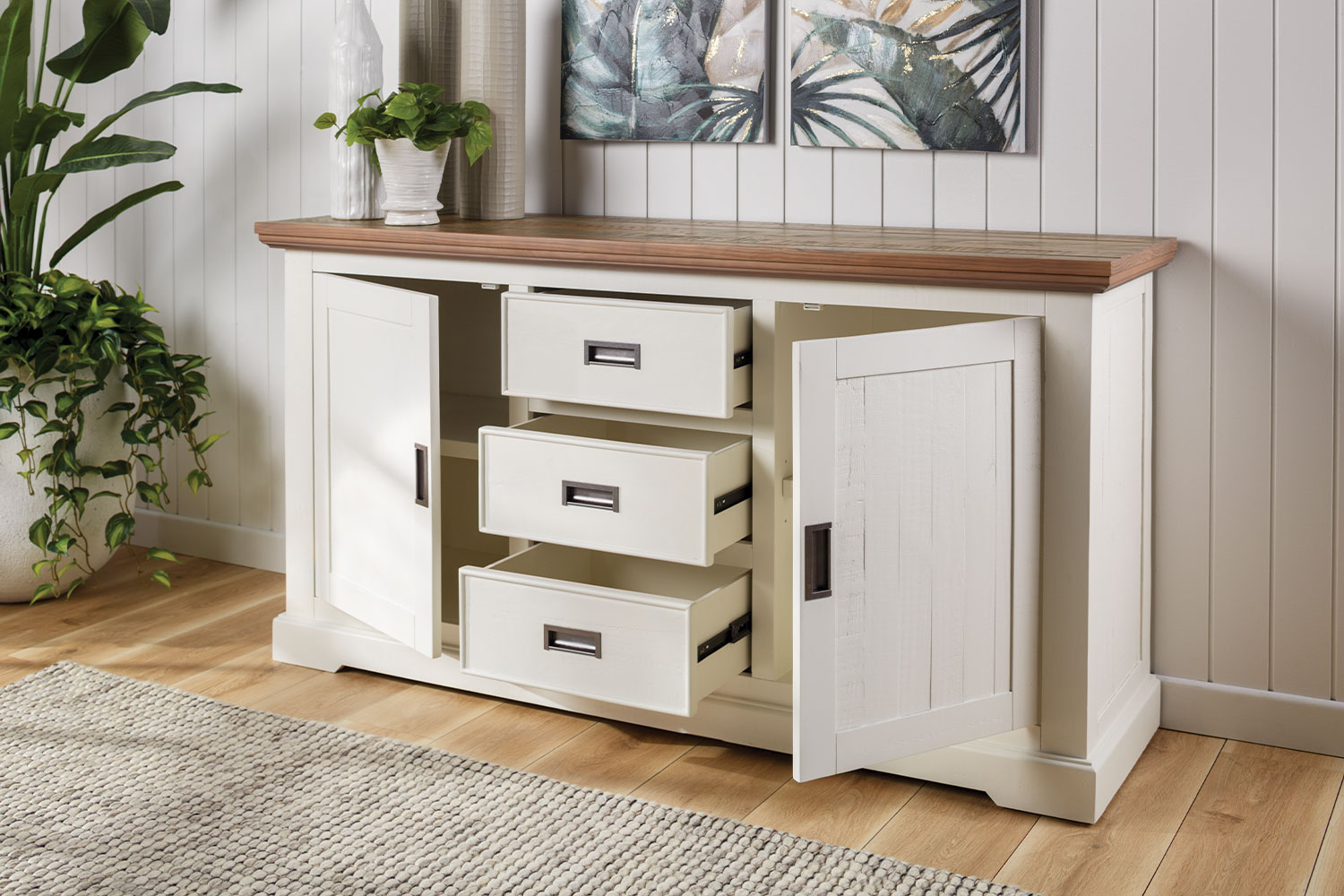 The Marlow 2 Door Buffet is the perfect addition to your dining area. Featuring 2 doors and 3 drawers on metal extension runners, it offers an abundance of storage. The Marlow Collection is sure to please those who appreciate diverse styles - Hamptons, Coastal, Modern Farmhouse or French Provincial. Durable solid pine timber construction, with a two-tone look, the natural oak coloured plank tops offer a rustic aesthetic, while a white painted finish on the legs adds a contemporary flair and a clean finish, which is further enhanced by the flat metal handles. The comprehensive range provides ample storage for all your essentials.