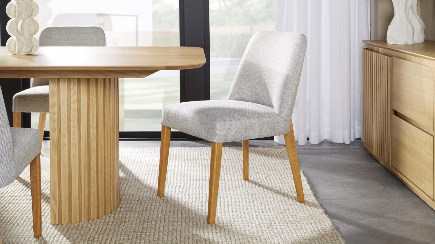 *Please Note: The price stated is for one Stanza Grey Fabric Dining Chair only. Accessories and other items shown are not included.
