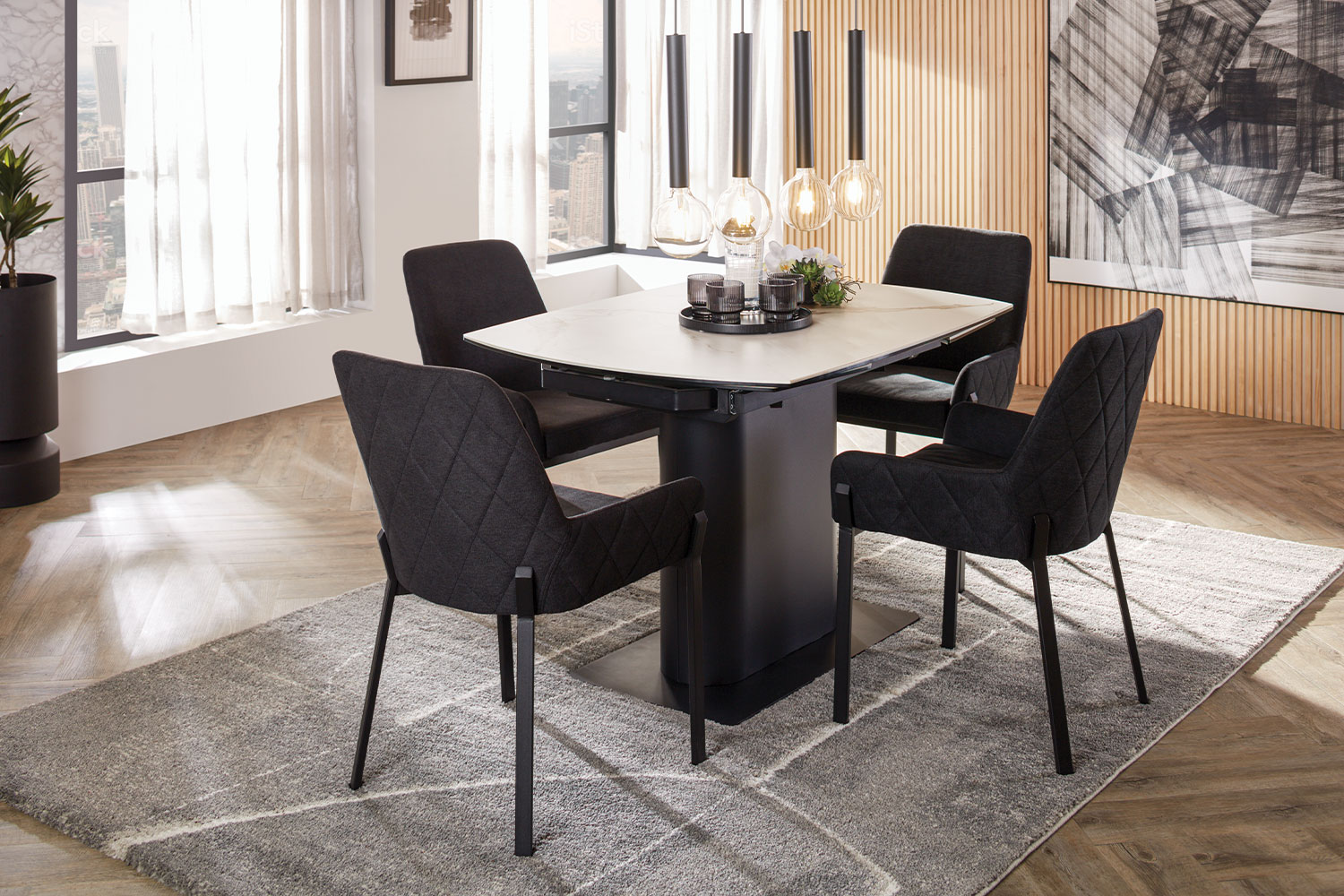 All it takes is 4 seconds to change the Juliet 5 Piece Dining Suite from seating 4 guests to seating more. Featuring a modern ceramic and glass tabletop with a black metal base, this dining table is the perfect addition to any space. The Everitt Dining Chairs are the perfect match for the Juliet Extension Dining Table. The luxurious quilt effect fabric matched with the signature power-coated metal legs, make these industrial-feel chairs the perfect dining chair.
