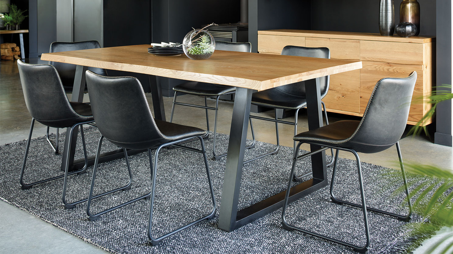 Elevate your dining space with the contemporary chic style of the Kubu collection, featuring a beautifully crafted cracked oak veneer tabletop. Designed and manufactured exclusively for Harvey Norman.