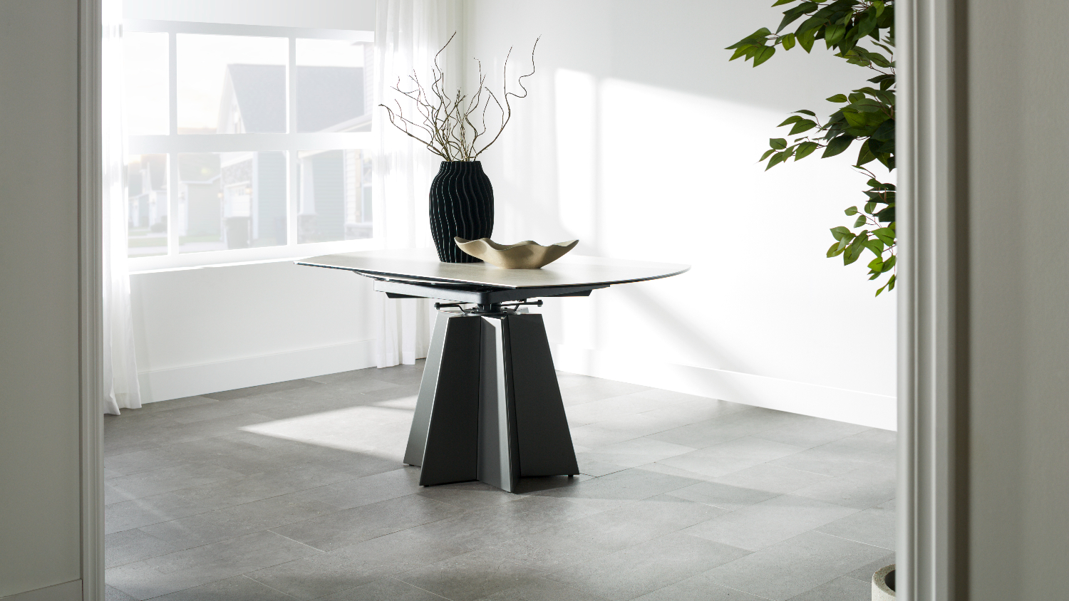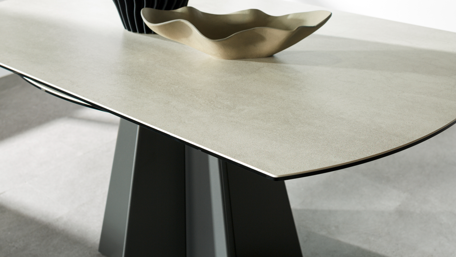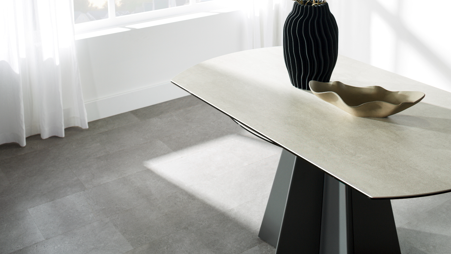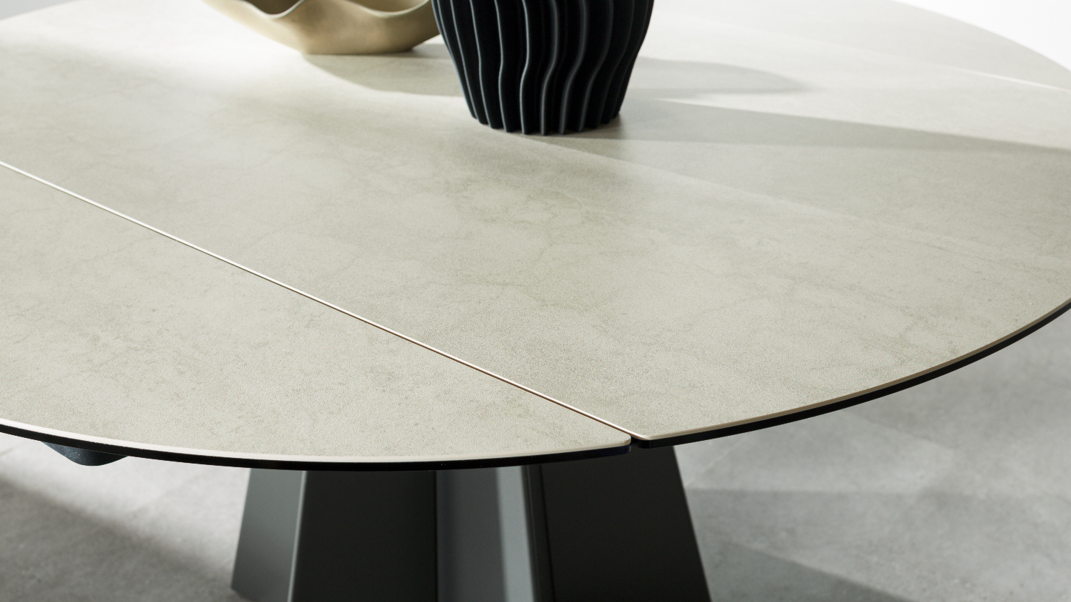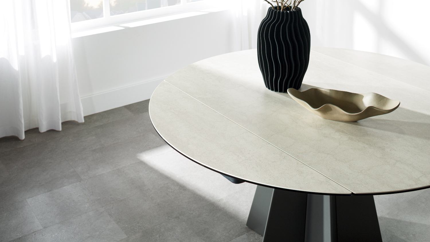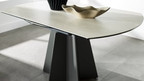 Bring a touch of modern elegance into your home with the Magnesa 900-1500mm Oval Extension Dining Table. This stylish table seamlessly combines flexibility and beauty, featuring an extendable design to cater to any occasion, a stunning table top of 3mm of Spanish Ceramic over 8mm tempered glass and a stable metal base in Morandi Ash coloured powder coating. It's the perfect choice for both compact and larger spaces.
