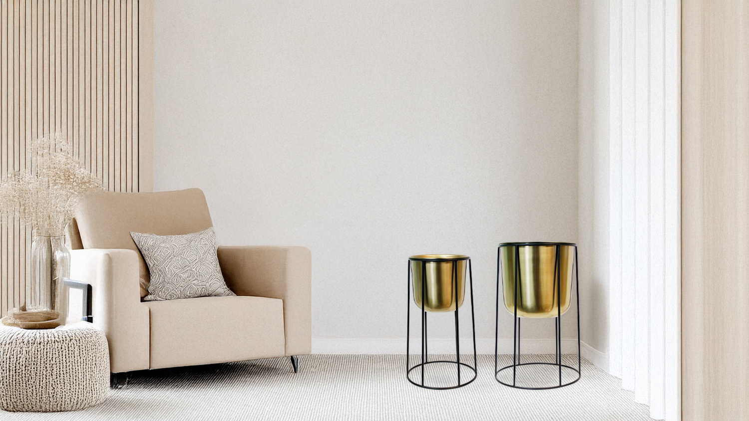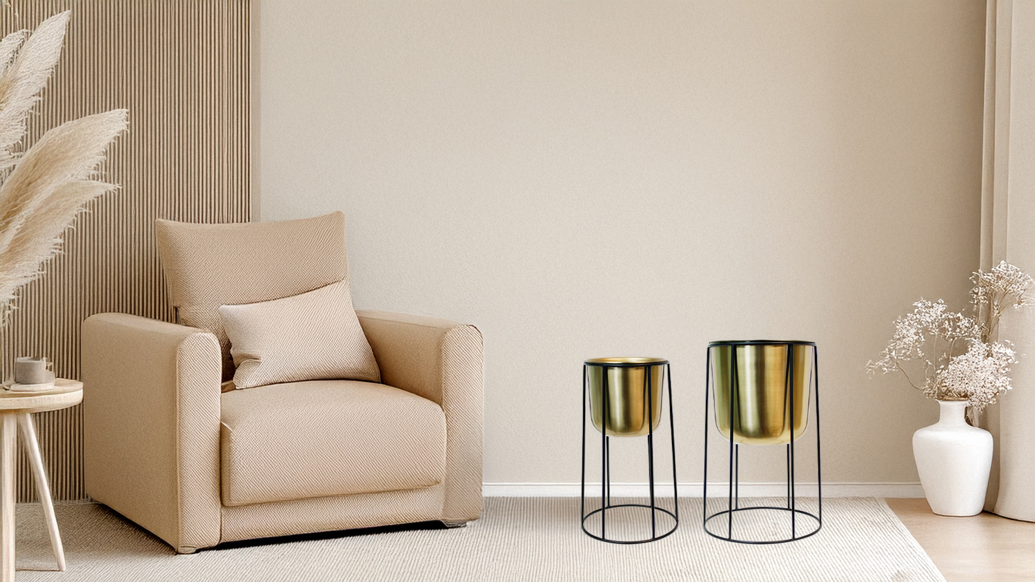 Bring a luxe, modern flair to your decor with the Metal Gold Planter on Black Stand Set. This 2-piece combo brings striking contrast and modern elegance to your space, thanks to its gold finish and sleek black stand. Built to last with durable metal and easy to clean, it’s a stylish upgrade for your indoor greenery.