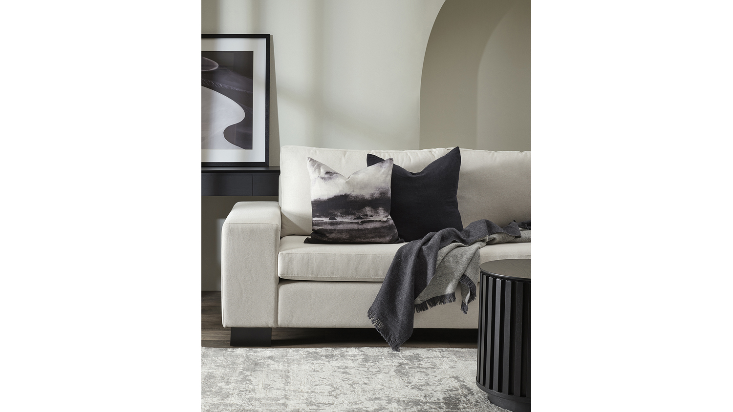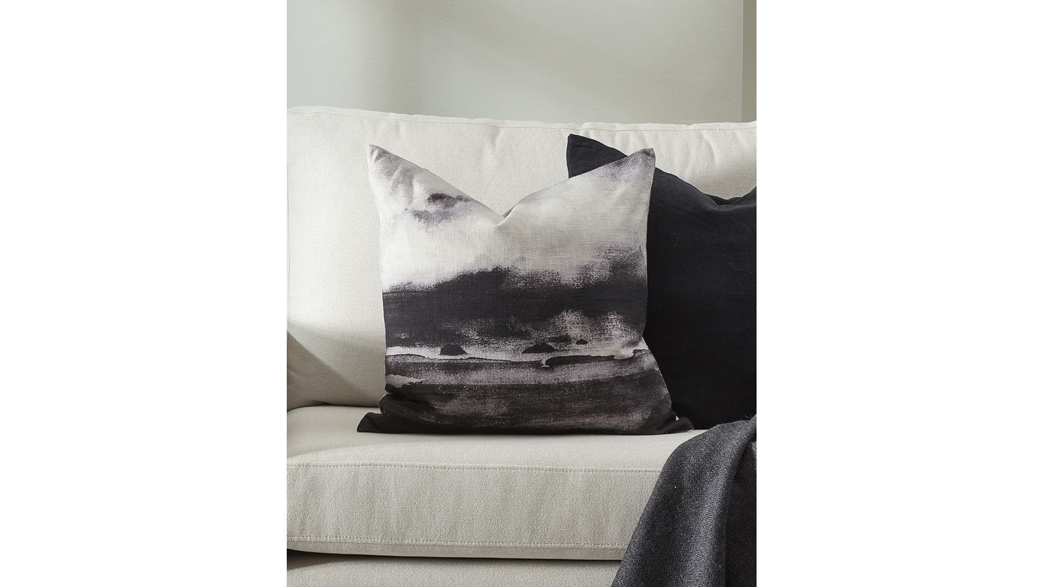 Refresh your décor with the Evenfall Feather Cushion. This oceanscape-inspired cushion features hand-painted watercolour detailing in striking black and grey tones. It also pairs seamlessly with Dolce Black for a chic, coordinated interior.