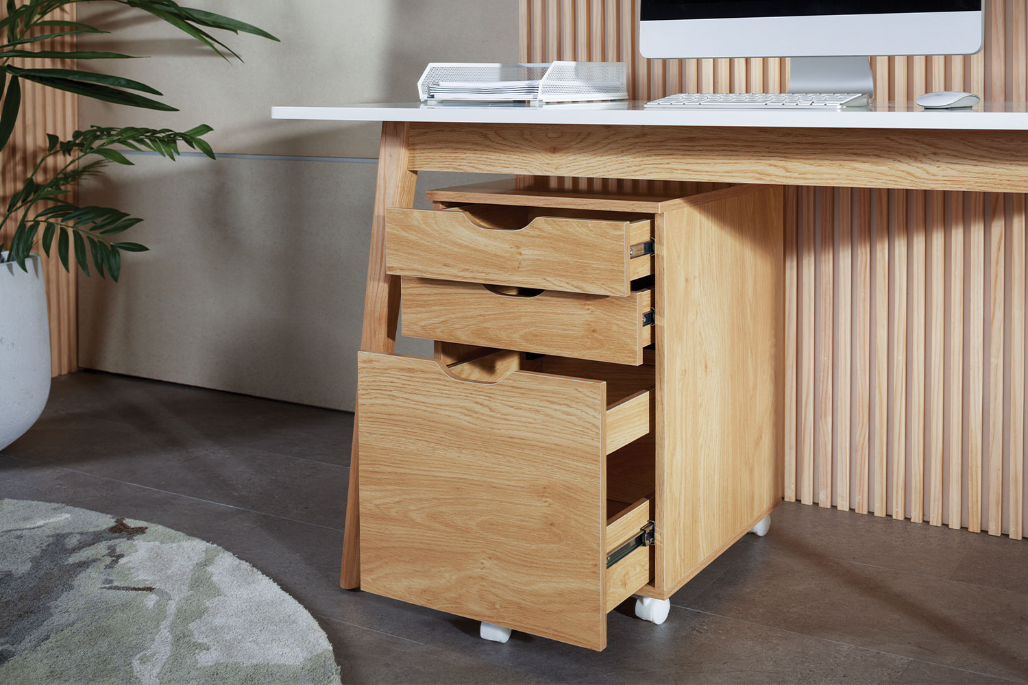 Upgrade your home office with the Denmark 3 Drawer Mobile, where modern design meets practical storage. Featuring a solid ash wood body with a melamine finish and white castor wheels with a locking mechanism, this mobile drawer unit brings Scandinavian styling to your workspace. With two stationery drawers and one larger filing drawer, this unit offers ample storage for all your office supplies.