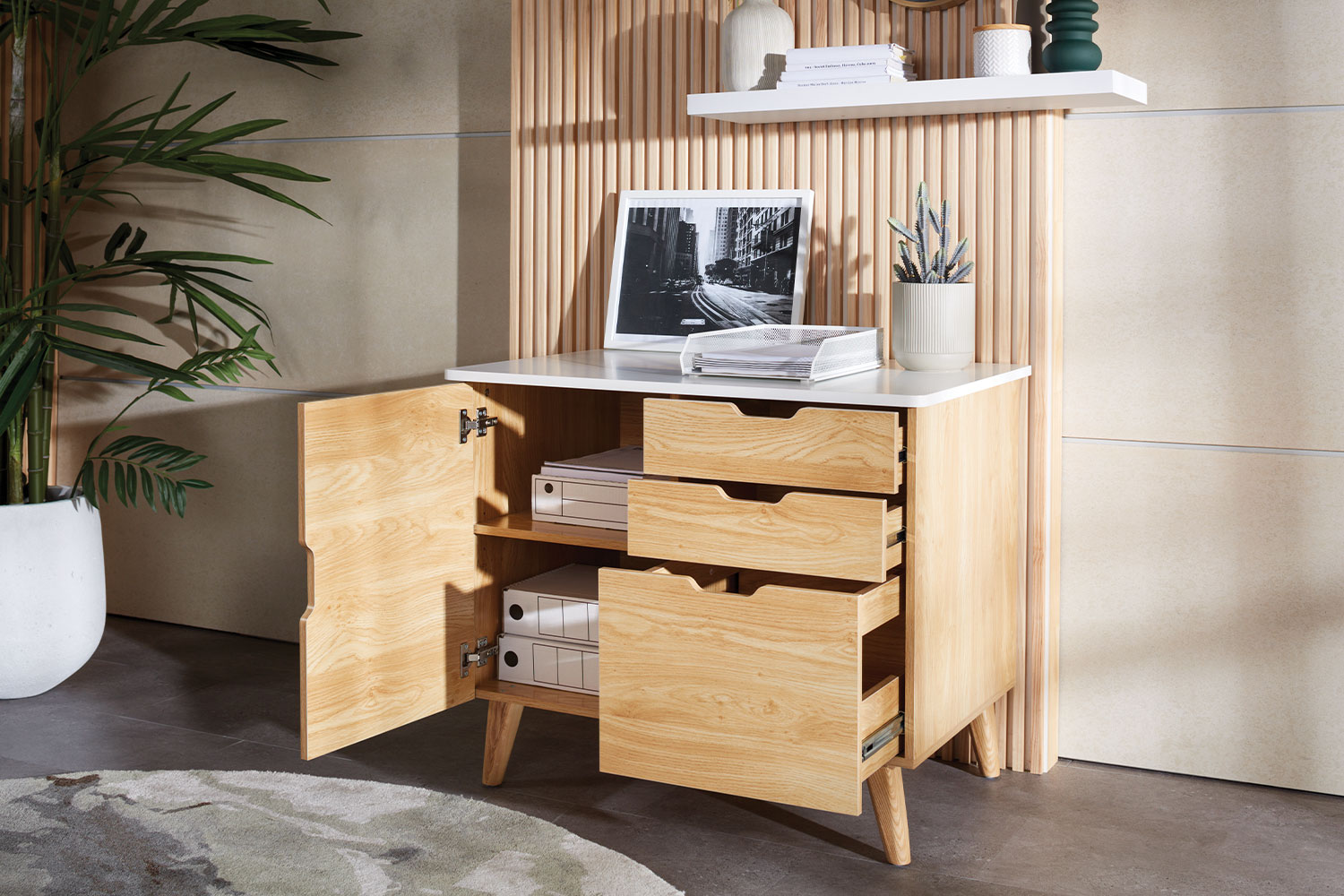 Enhance your home or office with the Denmark Credenza Desk! This Scandinavian-inspired furniture offers a simple yet stylish design, making it a perfect addition to any contemporary space. It also comes with practical storage options, allowing you to have ample space for various items.