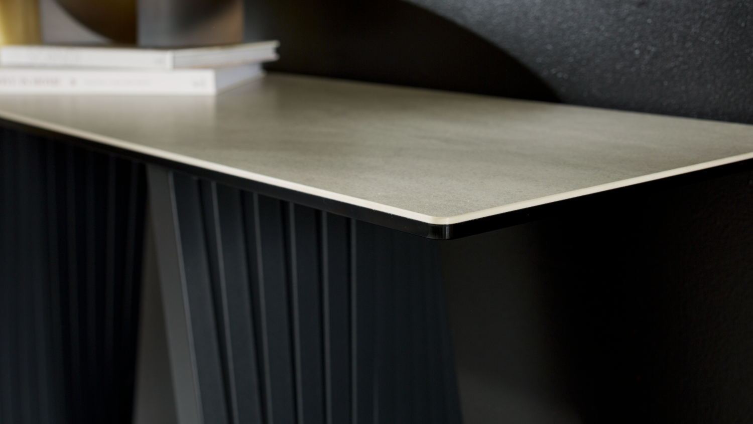 Step into your home and experience refined elegance with the Afinity Hall Table. This masterpiece features a luxurious ceramic tabletop with a tempered glass layer, perfect for holding your keys, wallet, or mail. For extra flair, this table is completed with sturdy metal legs finished in a contemporary black powder coating.
