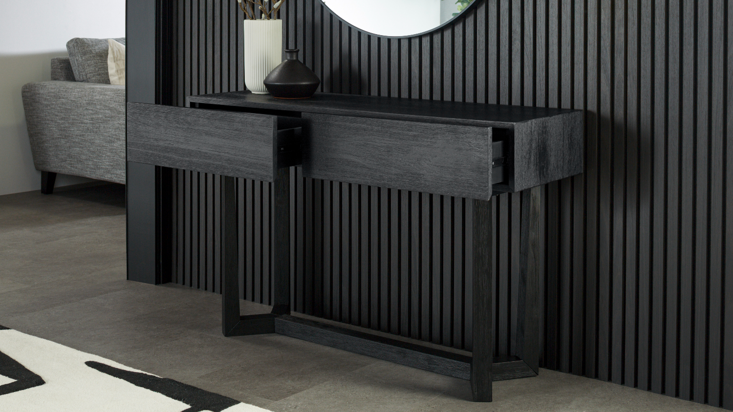 - An Entryway Essential: Infuse your home with organisation and style using the Sarsha 1200mm 2 Drawer Hall Table. This functional console is expertly designed to streamline your entryway, allowing you to drop your daily essentials the moment you walk in the door. It also highlights two closed compartments for discreet storage.
