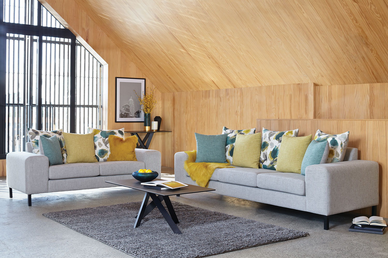 Brighten your living space with the Aspen 2 Piece Lounge Suite. This sleek design with modern metal legs adds a touch of industrial and features plush cushions for the highest comfort. This sofa is made in New Zealand and handcrafted with Kiln Dried Timber.
