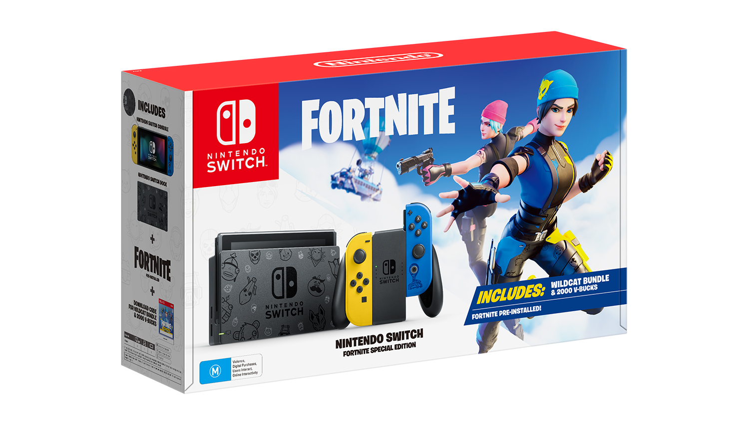 Experience a fun and exciting day in the comforts of your home with the Switch Fortnite Special Edition Bundle (M) by Nintendo. Featuring an exclusive skin design for Fortnite fans, this video game console furnishes ergonomic controllers, perfect for multiplayer and traditional console gamers. It includes a downloadable code for the Wildcat Game Bundle and 2000 V-Bucks for purchasing in-game items such as outfits, emotes, and more.