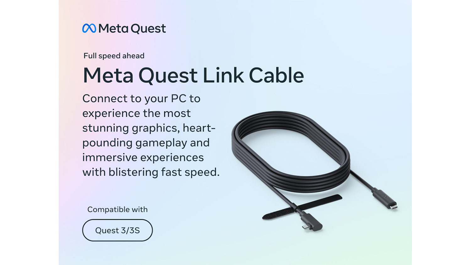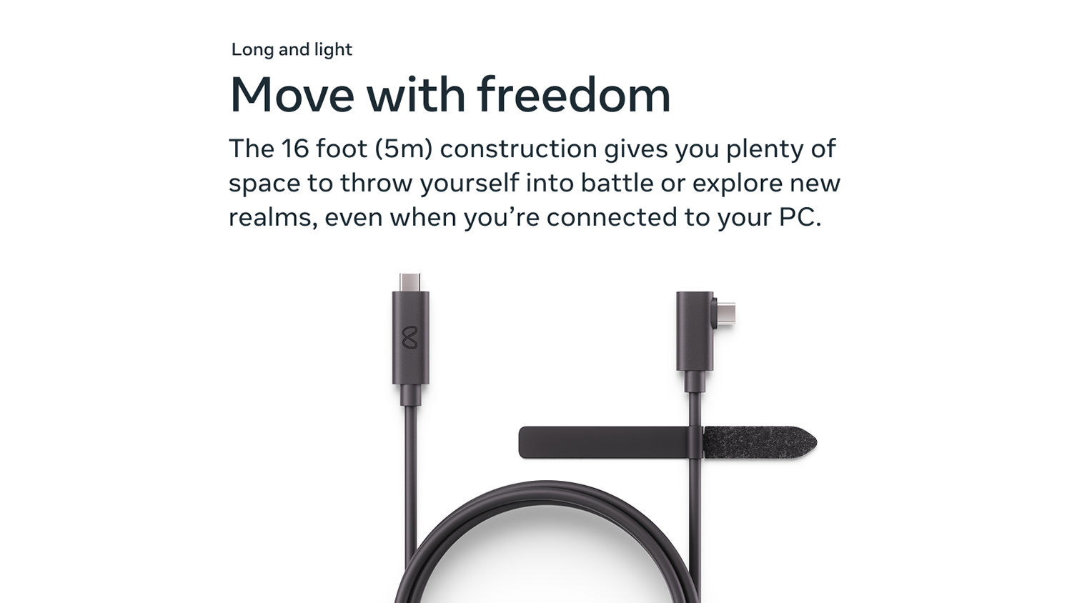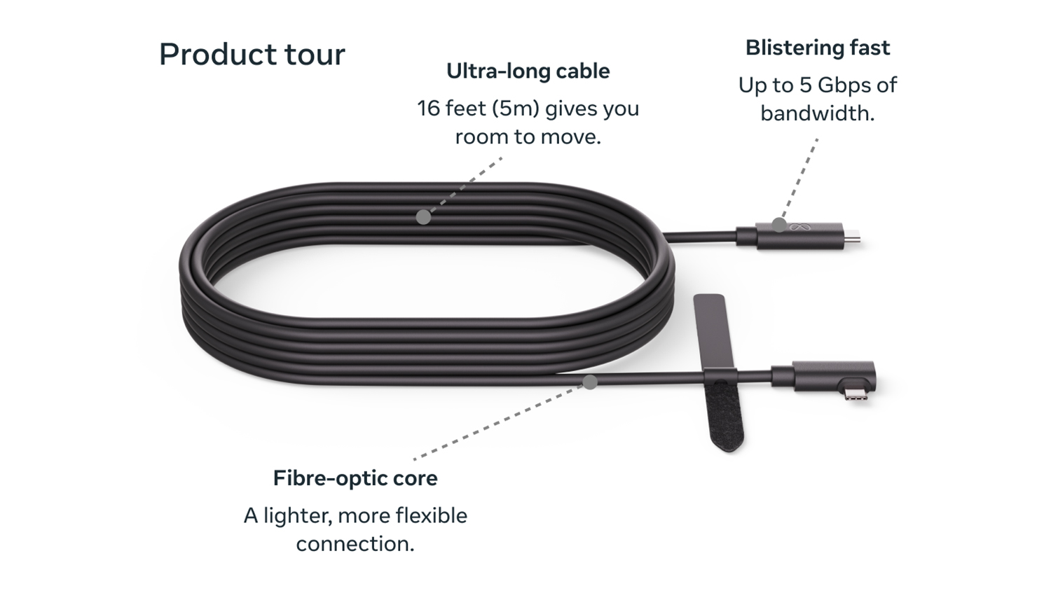 Level up your VR experience with the Meta Quest Link Cable for Meta Quest 3/3S Headset. This accessory lets you experience stunning graphics and smooth performance with a fast, stable connection that provides speeds up to 5 Gbps. Plus, the extra-long 16-foot fibre-optic USB-C cable keeps you moving freely while staying connected to your Meta Quest 3/3S headset.