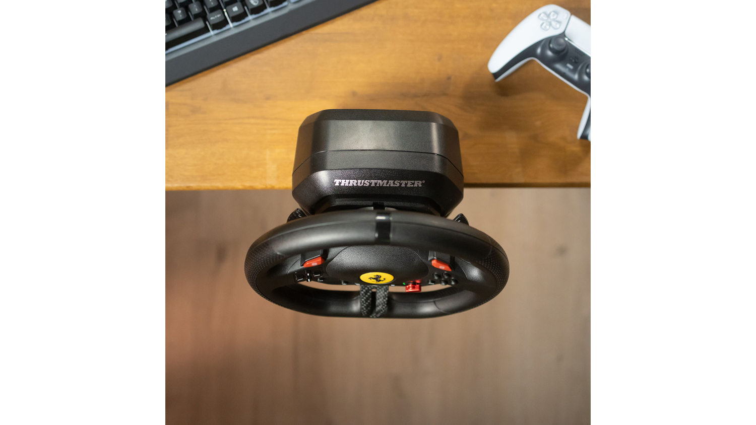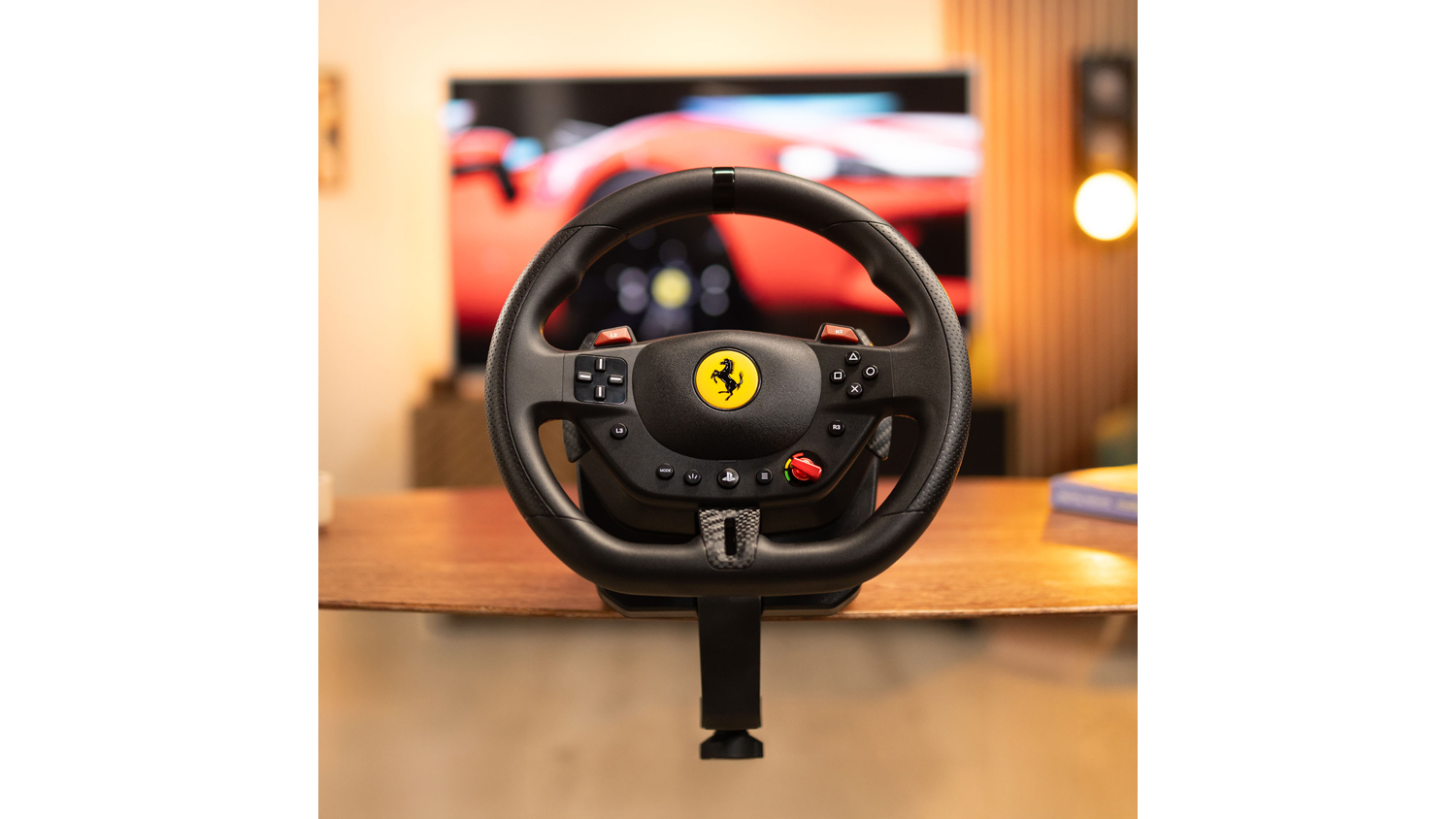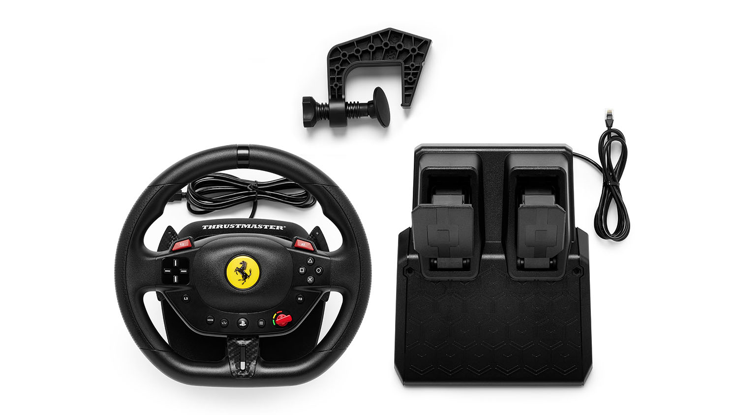 Experience the thrill of the track with the Thrustmaster T98 Ferrari 296 GTB Racing Wheel and Pedal Set for PlayStation. Ready to supercharge your rides, this set features a Ferrari-inspired steering wheel with recentering technology, 240° of rotation, and 3 driving profiles. It also includes a two-pedal set that incorporates a progressive resistance brake for consistent stopping power. Plus, this unit integrates a reliable clamping system that lets you mount it on desks and tables.