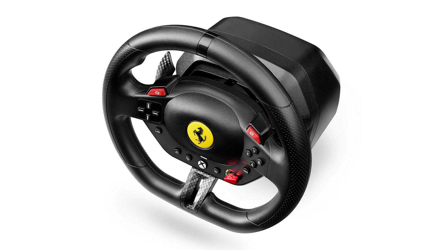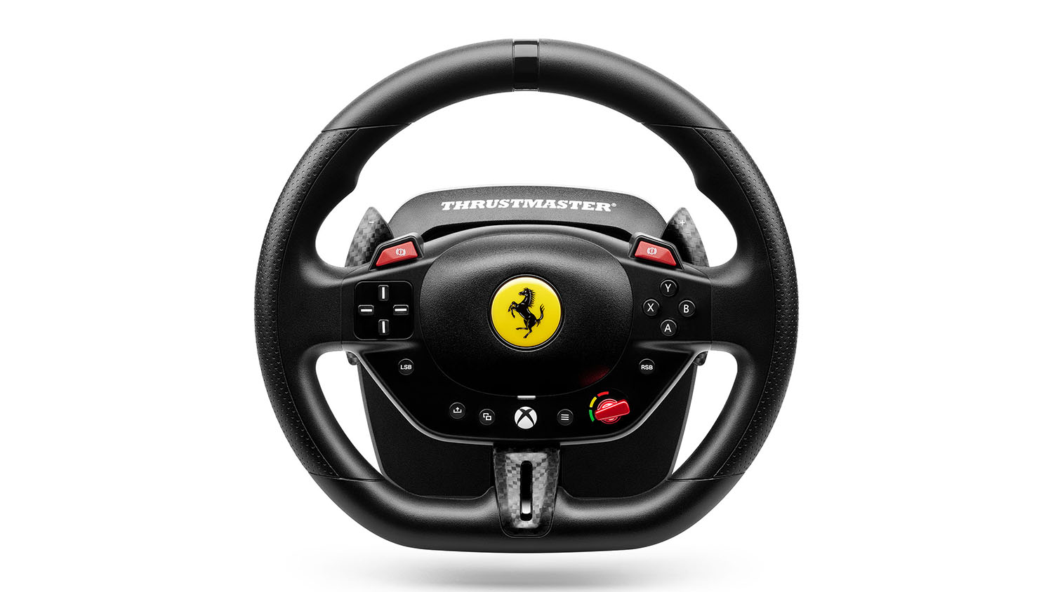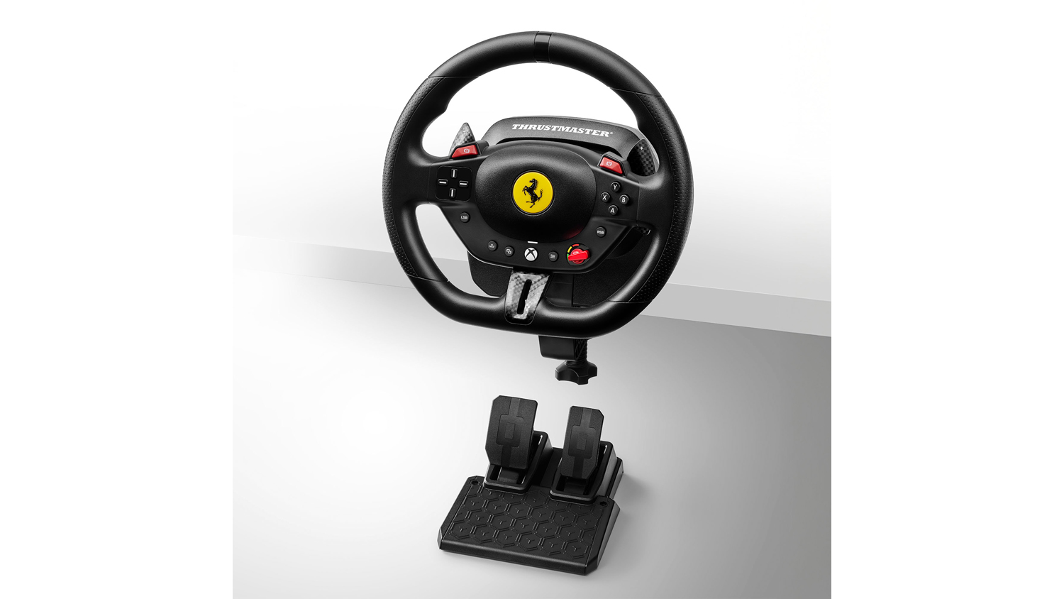 Experience the thrill of the track with the Thrustmaster T98 Ferrari 296 GTB Racing Wheel and Pedal Set for Xbox. Ready to supercharge your rides, this set features a Ferrari-inspired steering wheel with recentering technology, 240° of rotation, and 3 driving profiles. It also includes a two-pedal set that incorporates a progressive resistance brake for consistent stopping power. Plus, this unit integrates a reliable clamping system that lets you mount it on desks and tables.