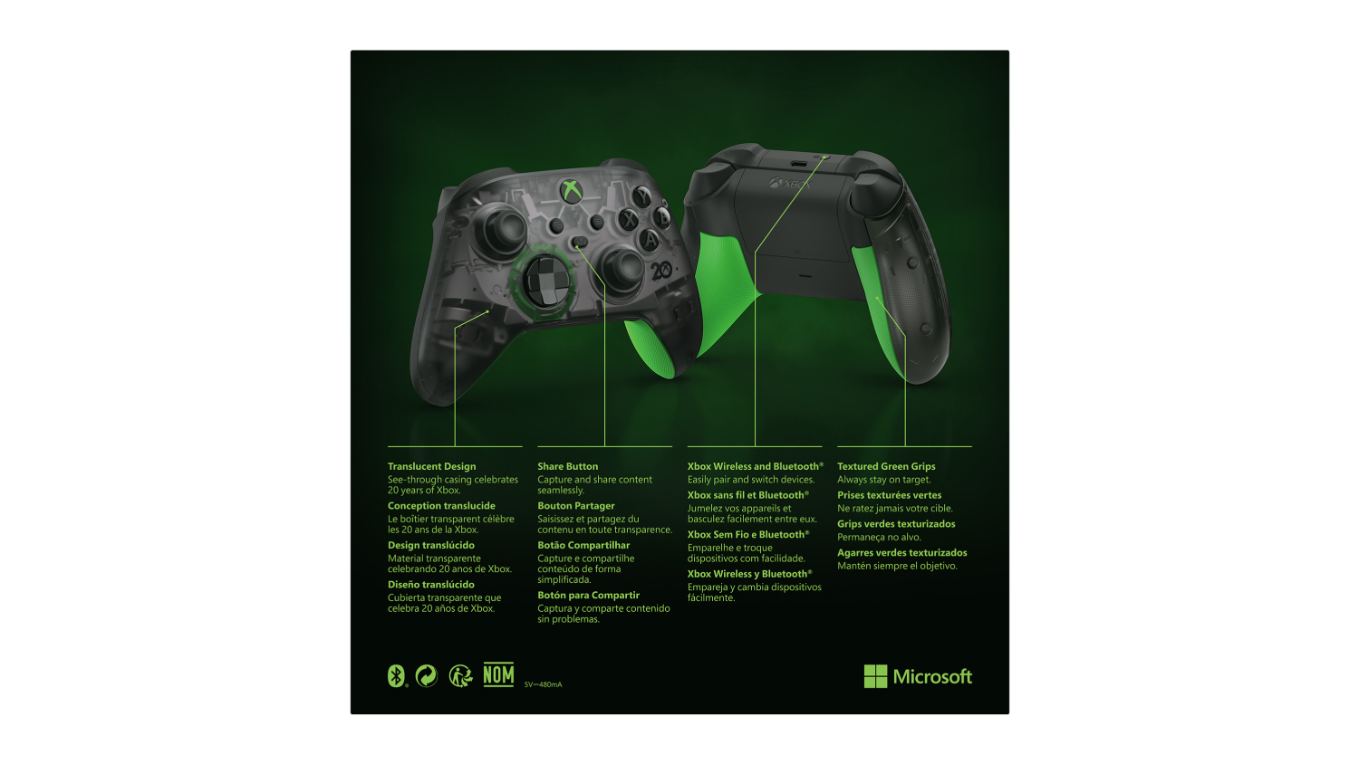 Enjoy utmost comfort as you play using this sleek and modernised Xbox Wireless Controller. Featuring a textured grip on triggers, bumpers, and back-case, this wireless controller provides you with the support and convenience you need to win over your games. To commemorate their 20th Anniversary, this controller features Xbox’s classic green colour palette matched with a translucent black casing. It also comes with interior silver details to showcase Xbox’s comprehensive technology.