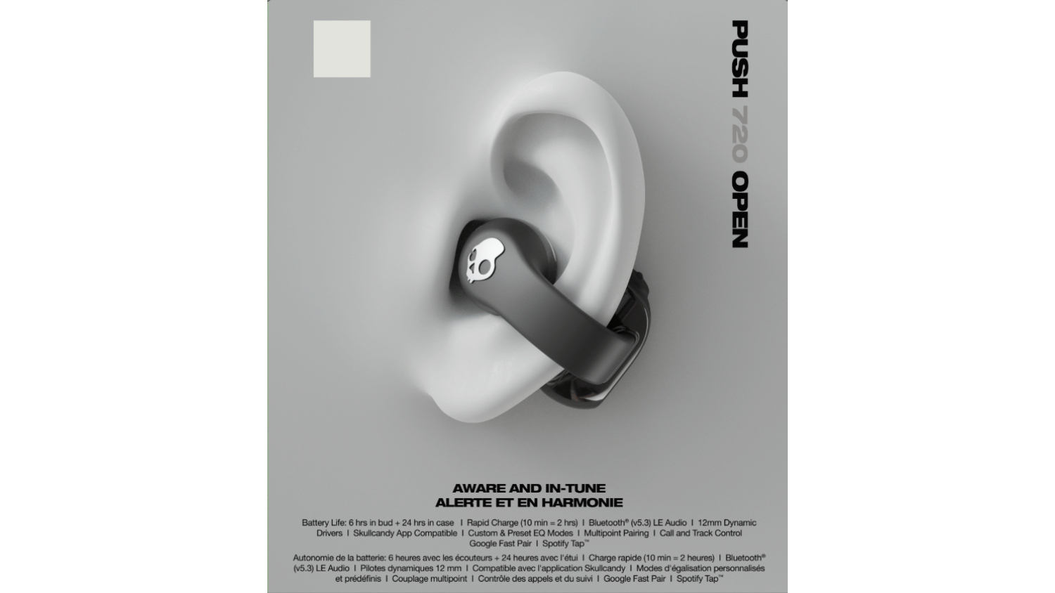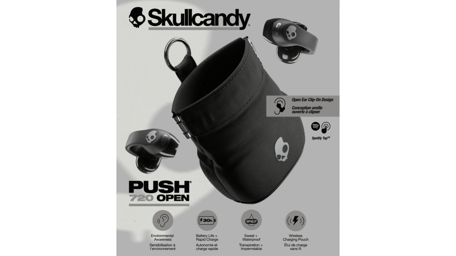 Step into a new era of audio with the Skullcandy Push 720 True Wireless Open-Ear Headphones, where you're always connected, never isolated. This audio masterpiece features an open-ear design, letting you enjoy your favourite tunes while staying aware of your surroundings. It also highlights a non-slip fit as well as an IP67 sweat and waterproof rating to keep up with your active lifestyle. Plus, this unit delivers a total of 30 hours of runtime, so you can listen for longer.