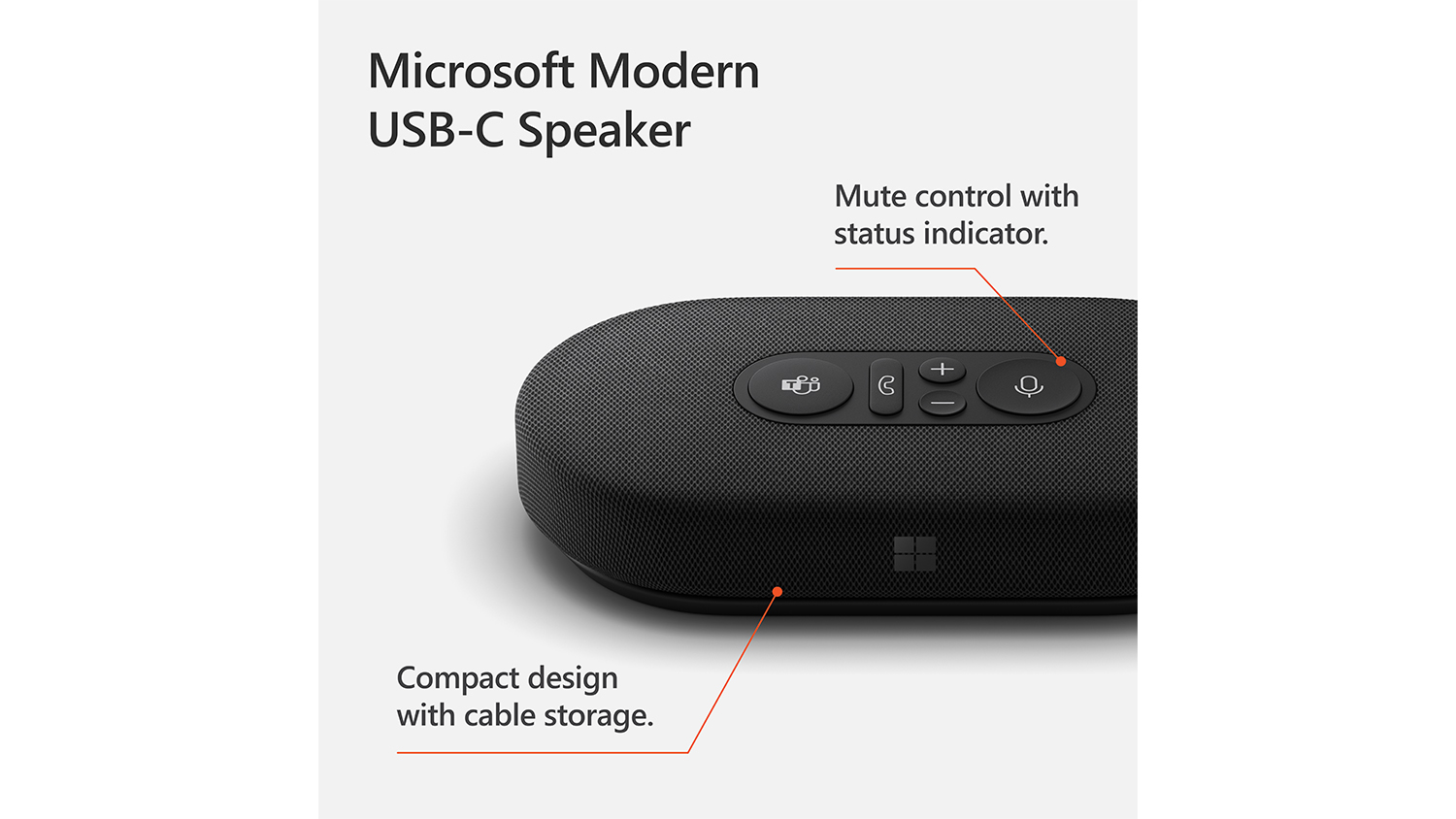 Microsoft's Modern USB-C Speaker is an ideal audio device for your workspace. This speaker offers a compact design, so you do not feel crowded at your desk. There are also five simple controls on the unit, including a Microsoft Teams button, mute button, volume up button/volume down button, and a hook switch button. Furthermore, this Modern USB-C speaker is compatible with Windows 10 computers, including the Surface systems.