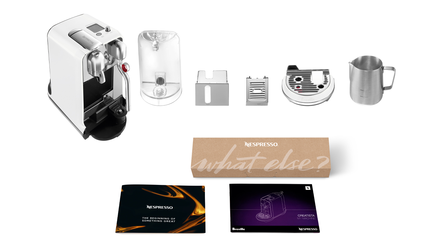 What’s in the Box: This coffee machine comes with 1 x stainless steel milk jug, 1 x Tasting box of Nespresso Capsules, and 1 x steam wand cleaning tool.