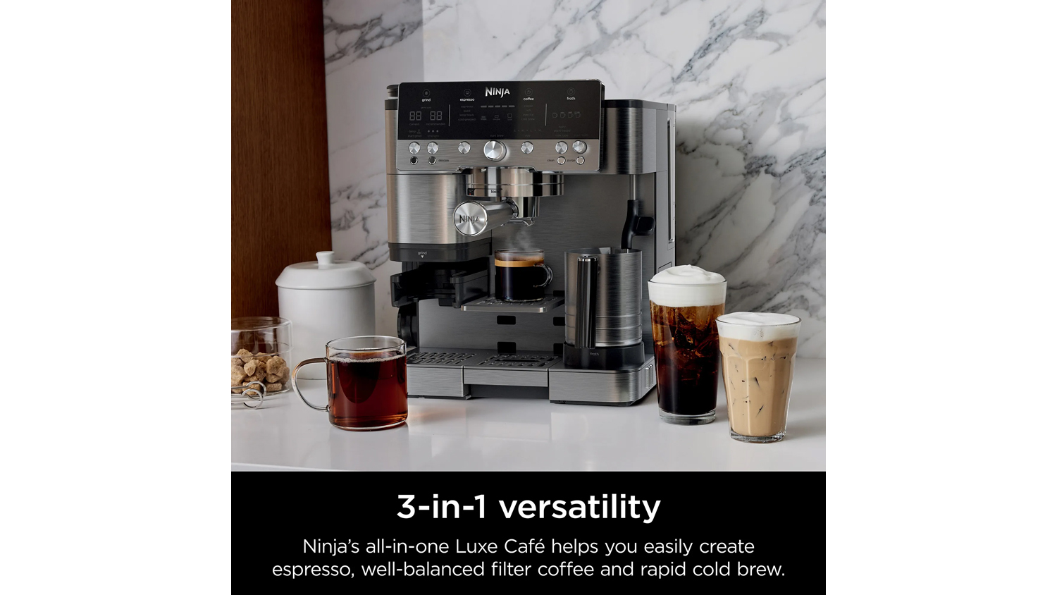 Discover simplicity and perfection in every cup with the Ninja Luxe Cafe Premier Manual Espresso Machine, designed for those who believe great coffee is an experience. Boasting 4-in-1 versatility, this unit lets you have access to a delicious shot of espresso, a well-balanced drip coffee, a refreshing cold brew, and hot water. It also includes numerous convenient features such as Barista Assist Technology, Dual Froth System Pro, 15+ drink presets, and more.
