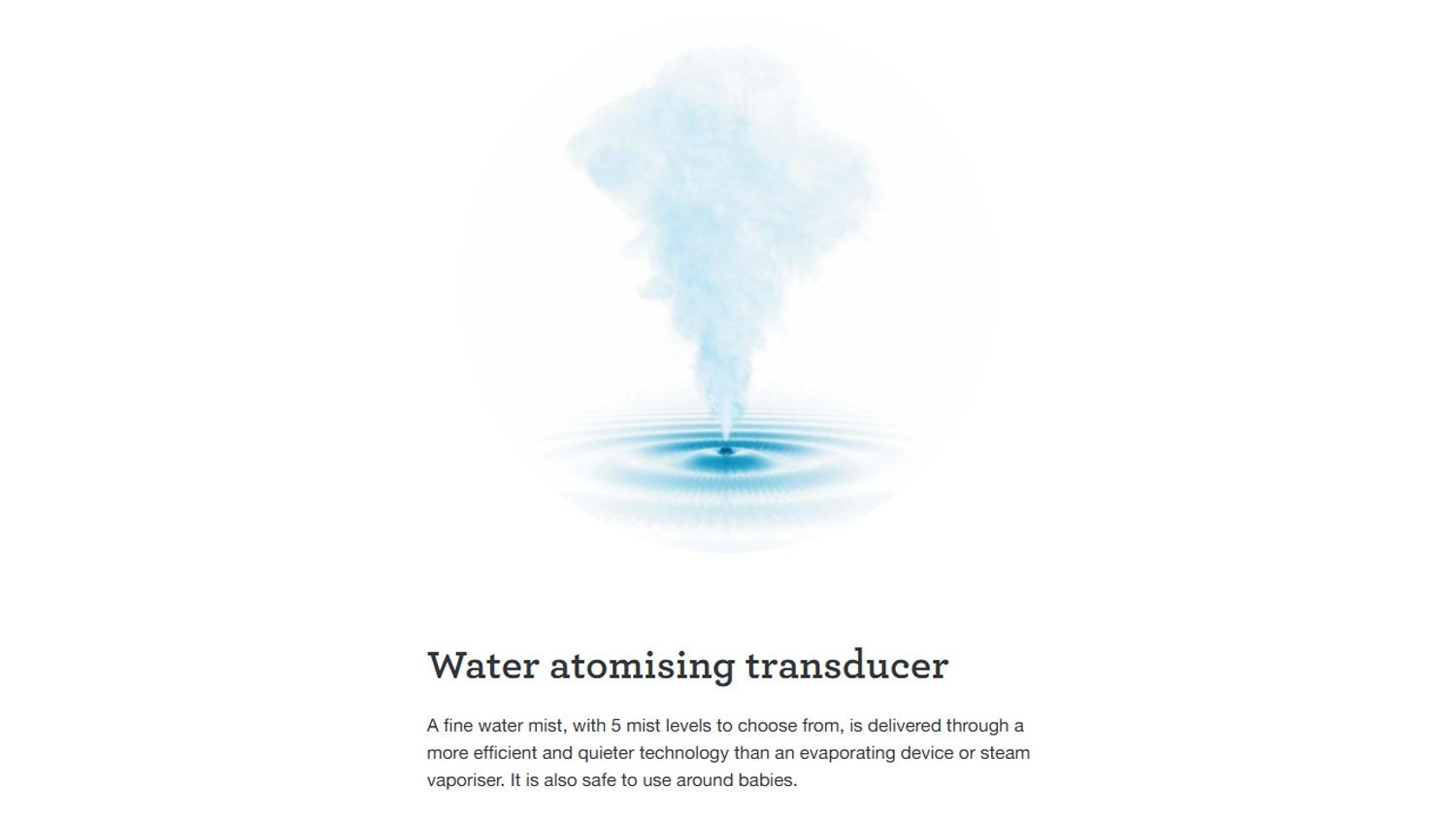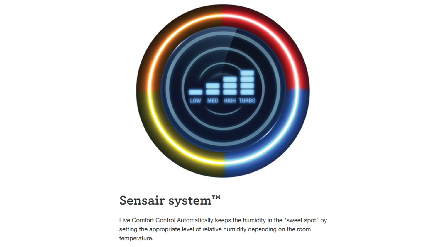| Sensors | SensAir System™ Live Comfort Control Automatically keeps the humidity in the "sweet spot" by setting the appropriate level of relative humidity depending on the room temperature |
